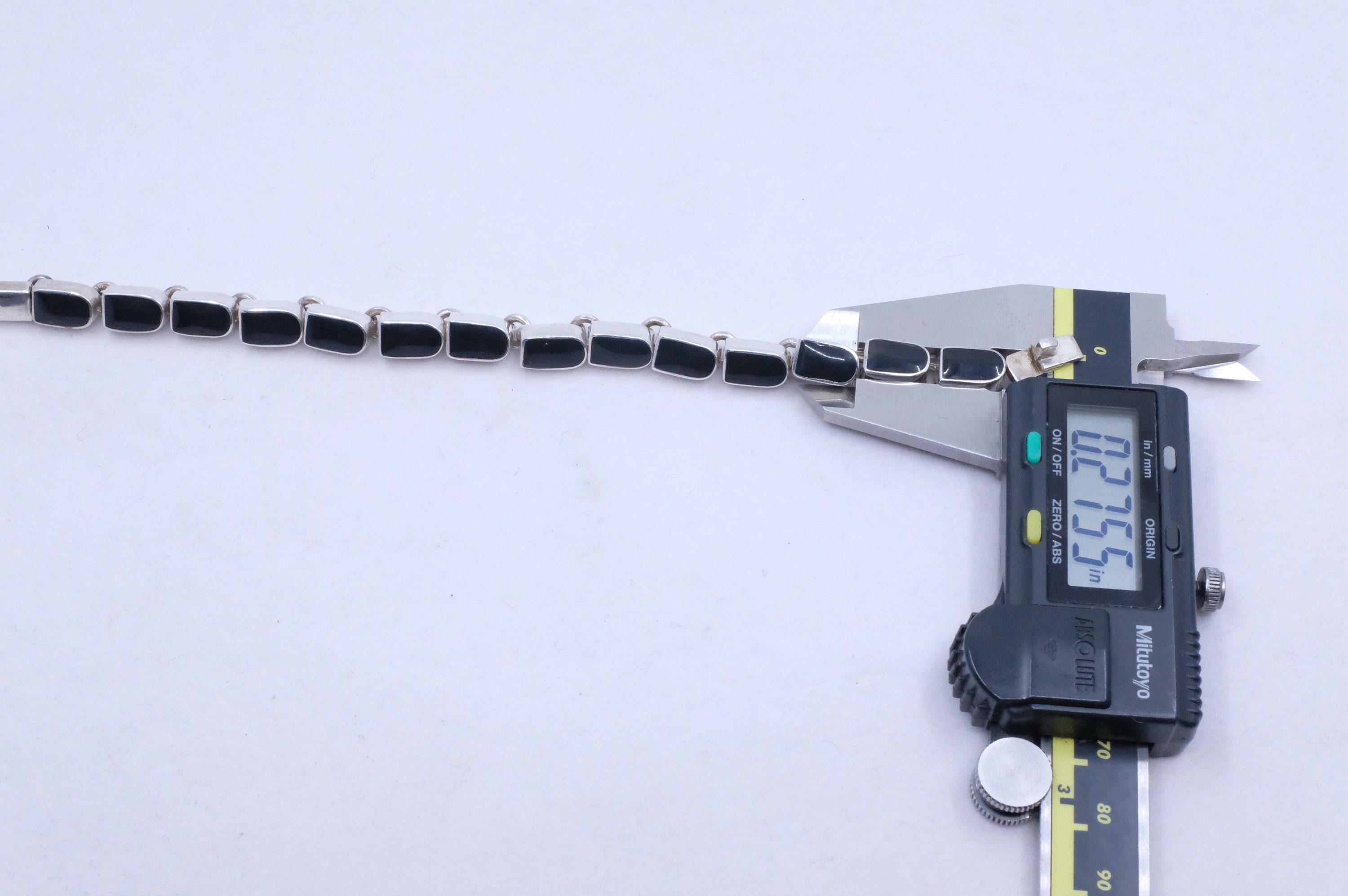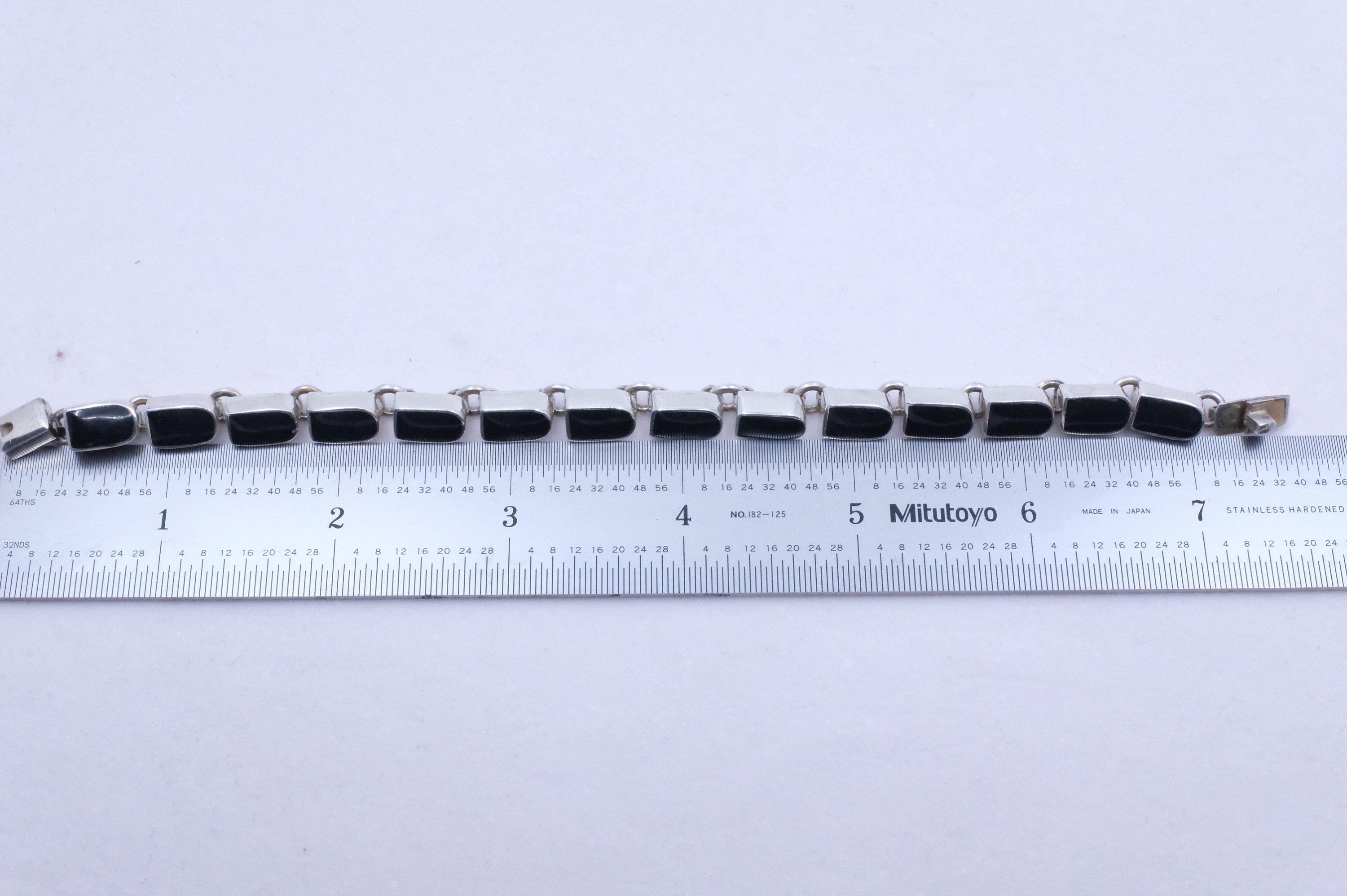 This is a sterling silver and onyx tennis bracelet. It is dainty and perfect. It is edgy and perfect. It's just perfect.