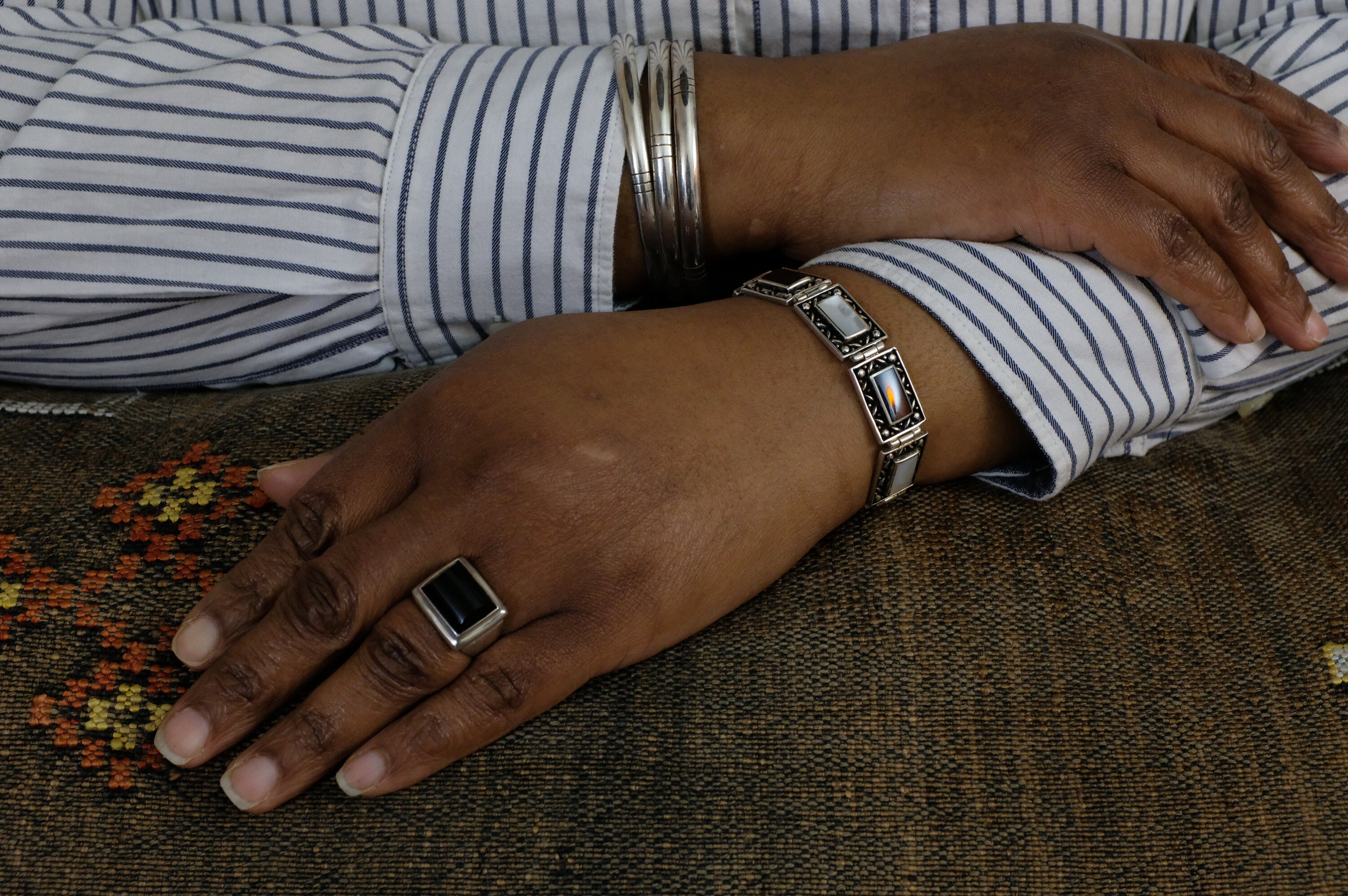 I love these vintage mother-of-pearl bracelets so much, but I don't own one yet. This bracelet has the added bonus of onyx. This bracelet looks beautiful alone, but that's not your only choice. You can group the bracelet with onyx or mother of pearl jewelry as well as plain sterling silver jewelry. Black and white works well with many different color combinations, so it's also easy to style. A great piece to marry modern with classic styles.