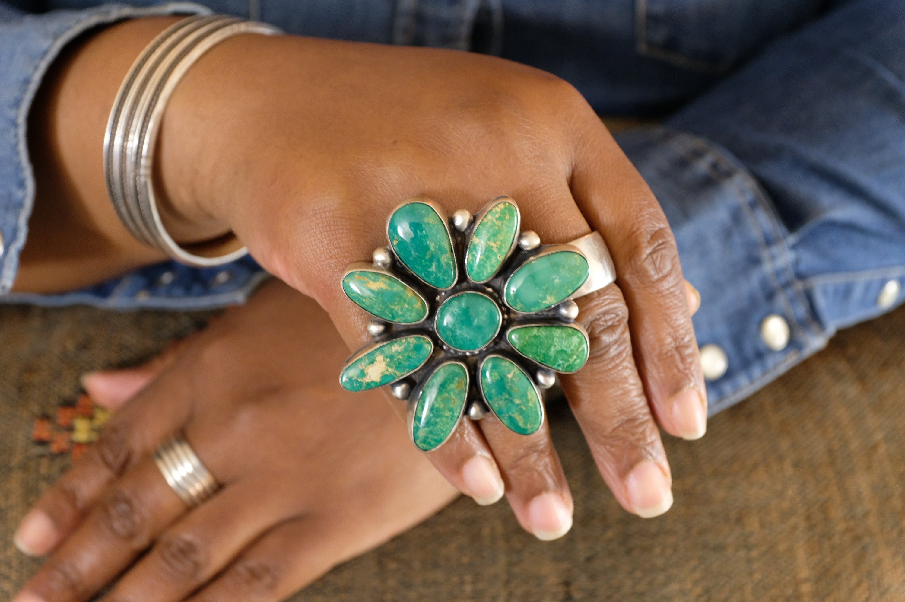 Radiate confidence with this captivating turquoise cluster ring. The gemstones are of genuine Nevada green turquoise. It is among the most beautiful green varieties of turquoise in the world. This large statement ring was crafted by Bobby Johnson and stamped with his silver mark, "B. Johnson". Bobby Johnson is known for having a unique approach to Navajo jewelry motifs.