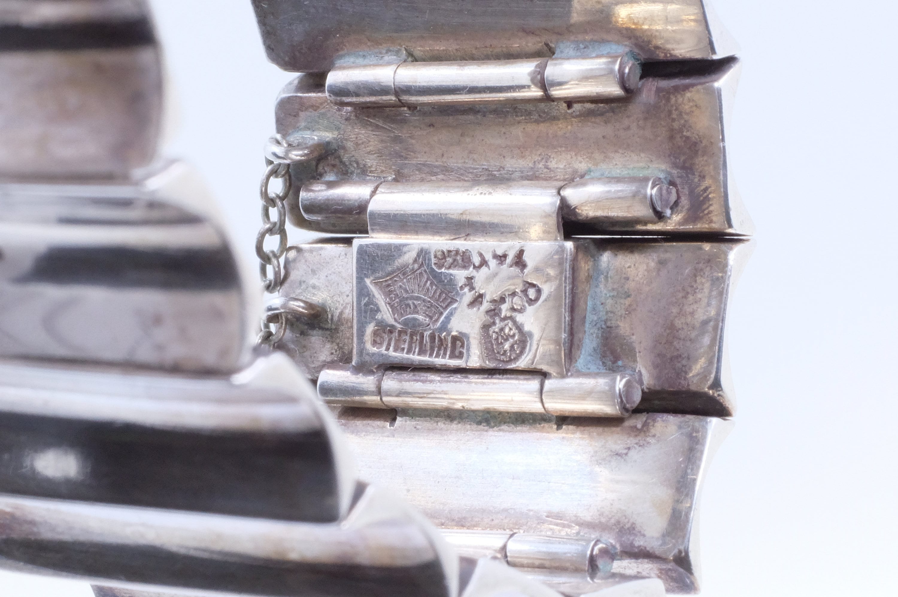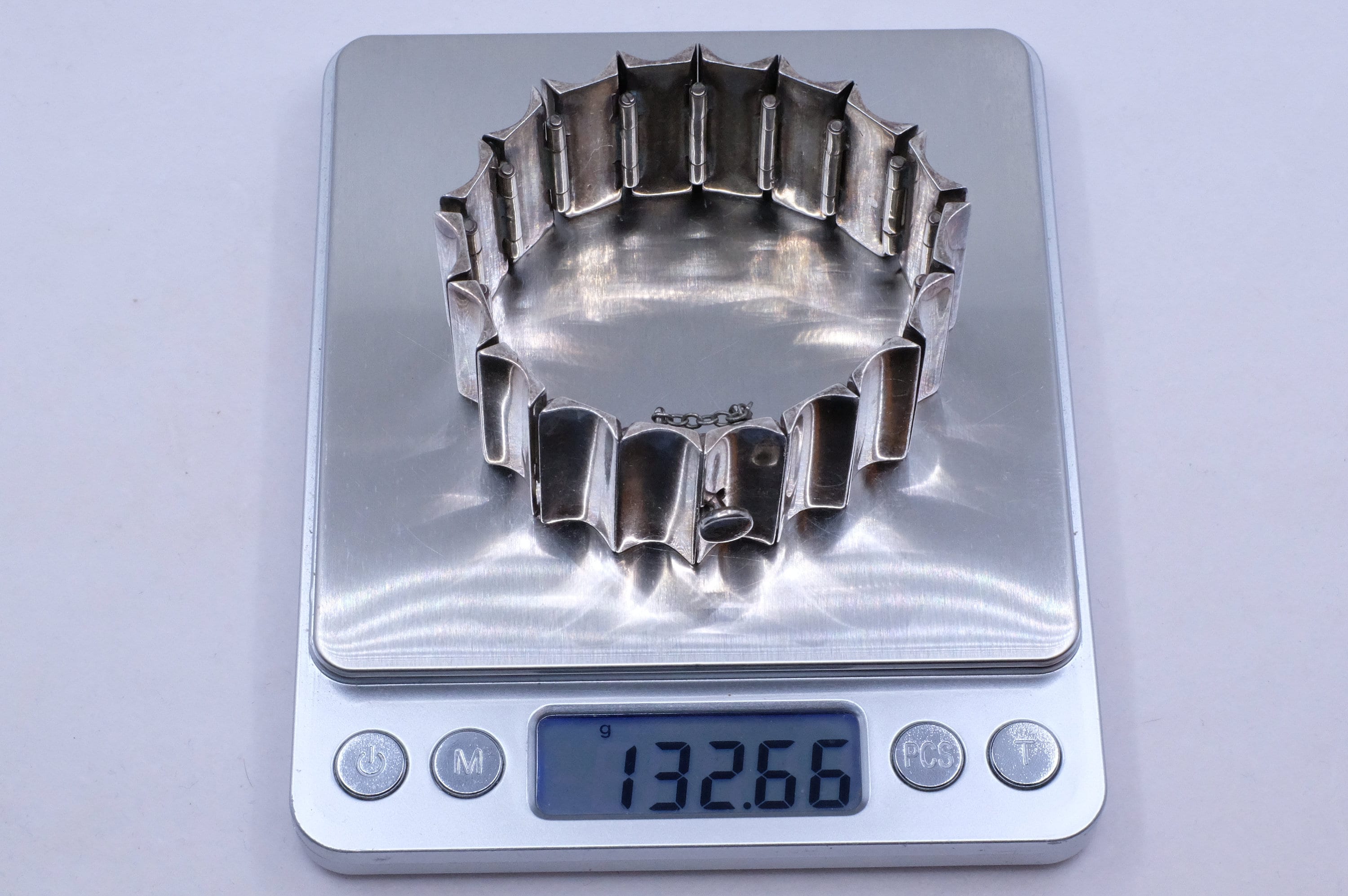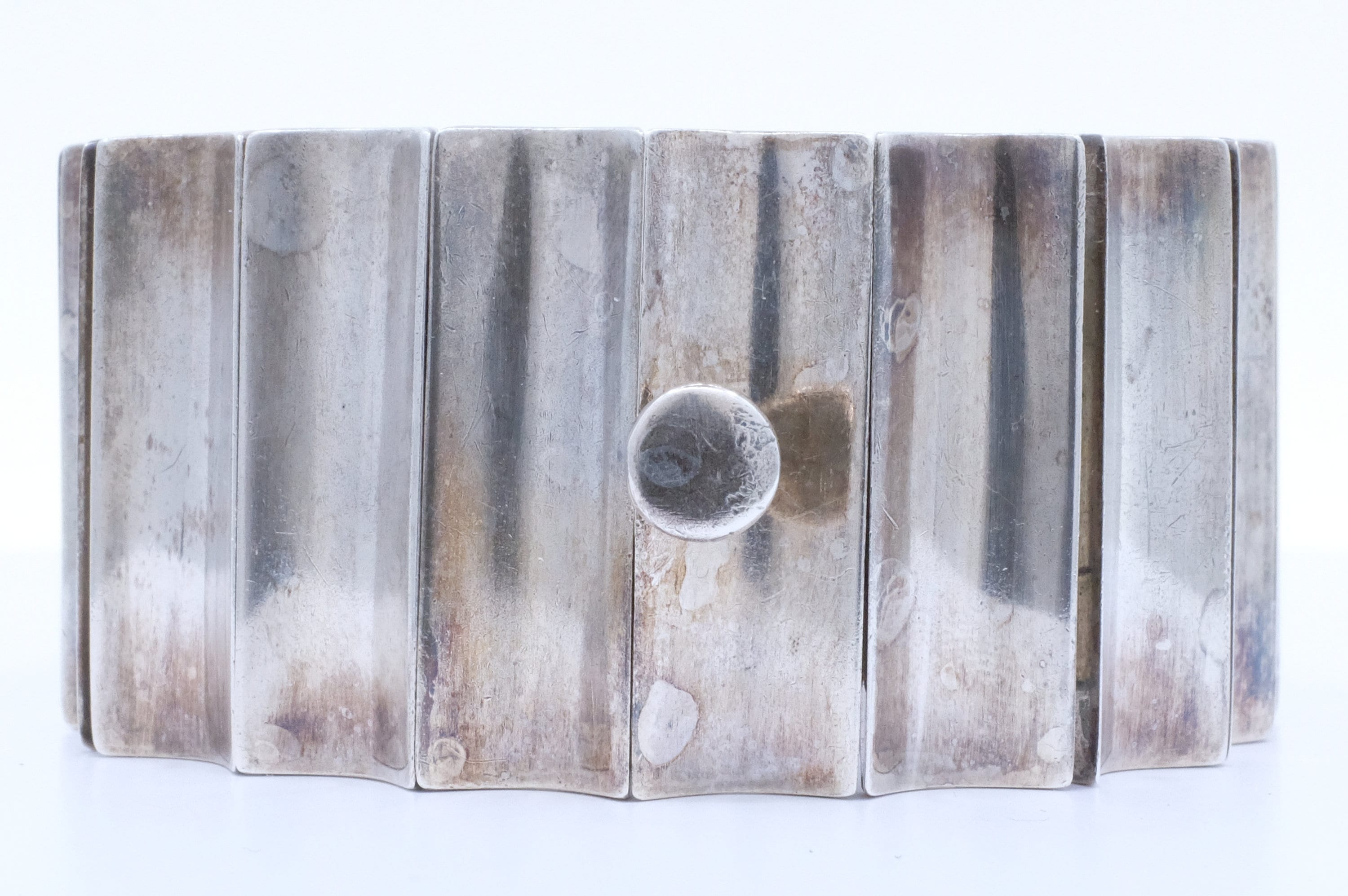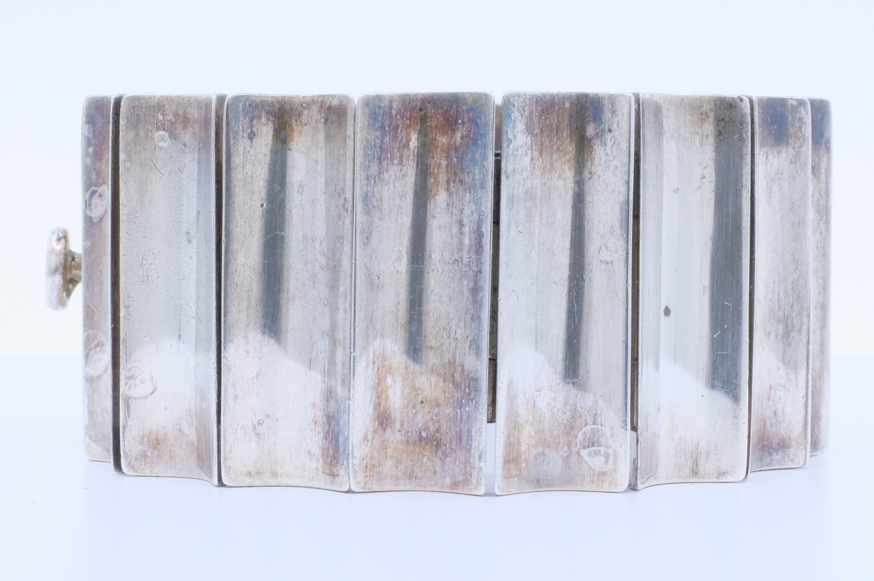 If there is someone whom I wish I could interview, it would be maestro Antonio Pineda. His designs are some of the most imaginative and enduring sterling silver jewelry designs of the last 100 years. He was primarily a modernist jewelry designer. We're lucky to have come across just one of his designs. This sophisticated modernist bracelet features concave articulated wedges. In my mind, it's a silver sculpture that you get to wear. A person who designs in this way really reveres the wearer. I am so lucky to be able to share it with you.