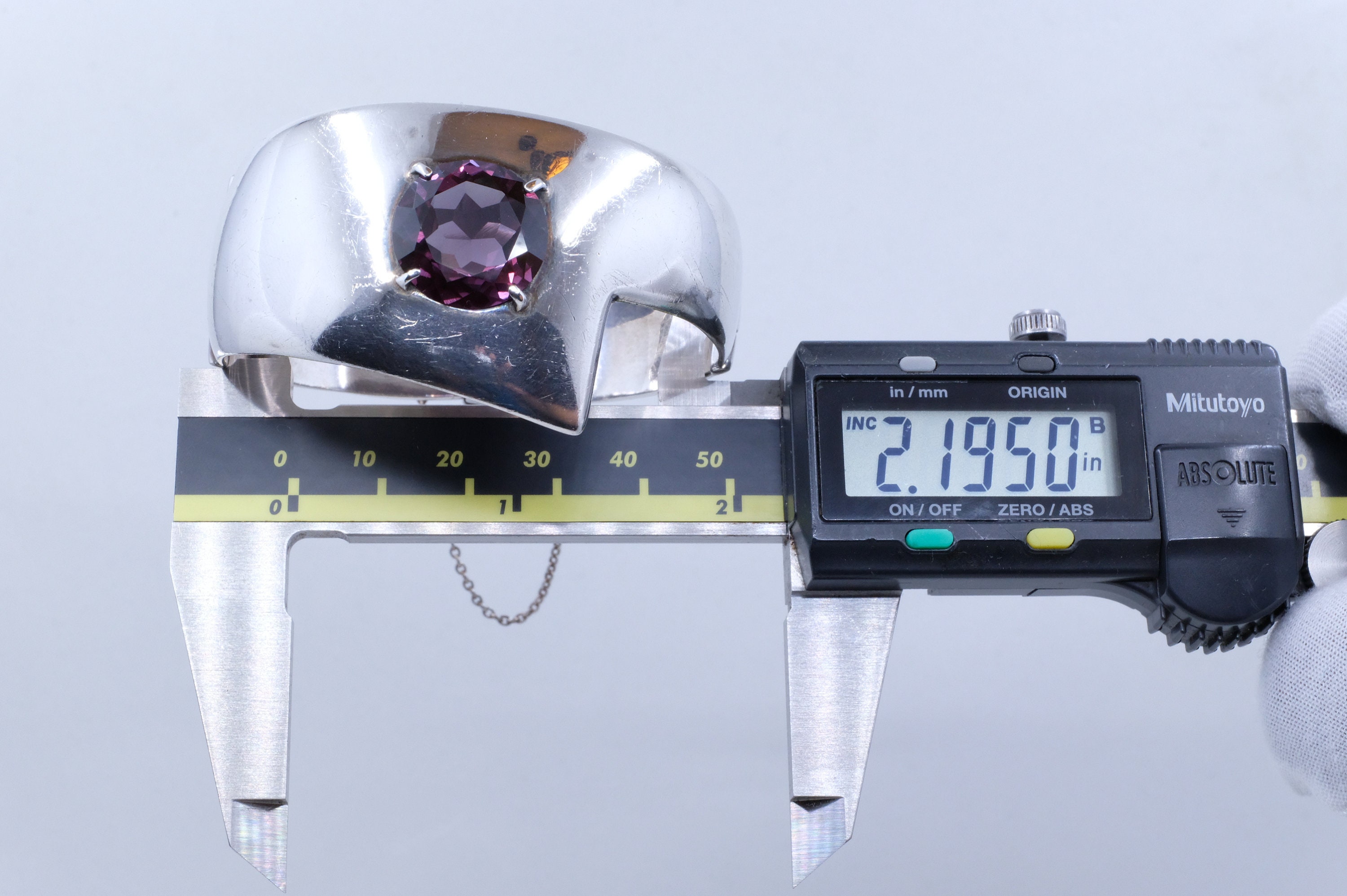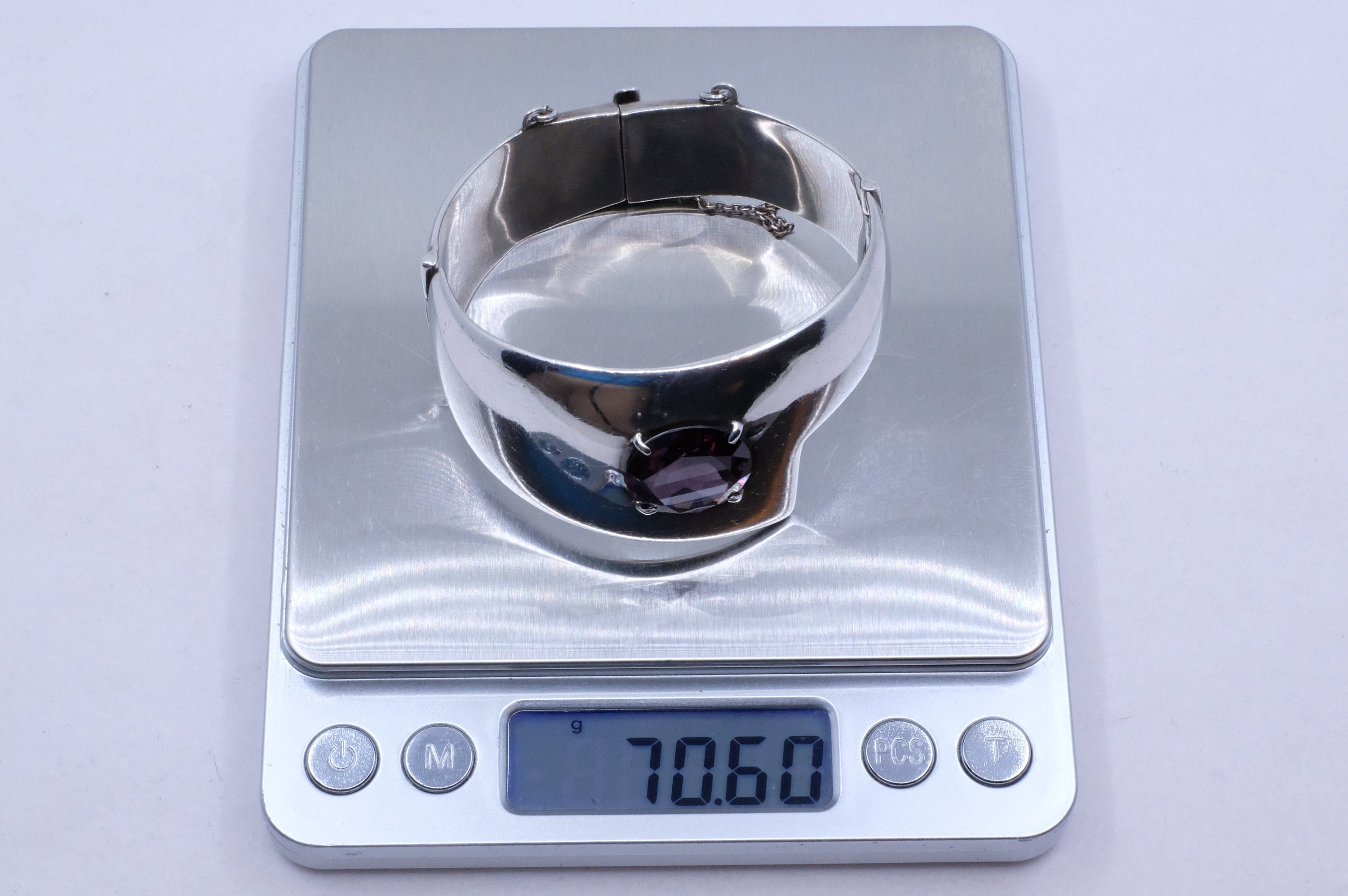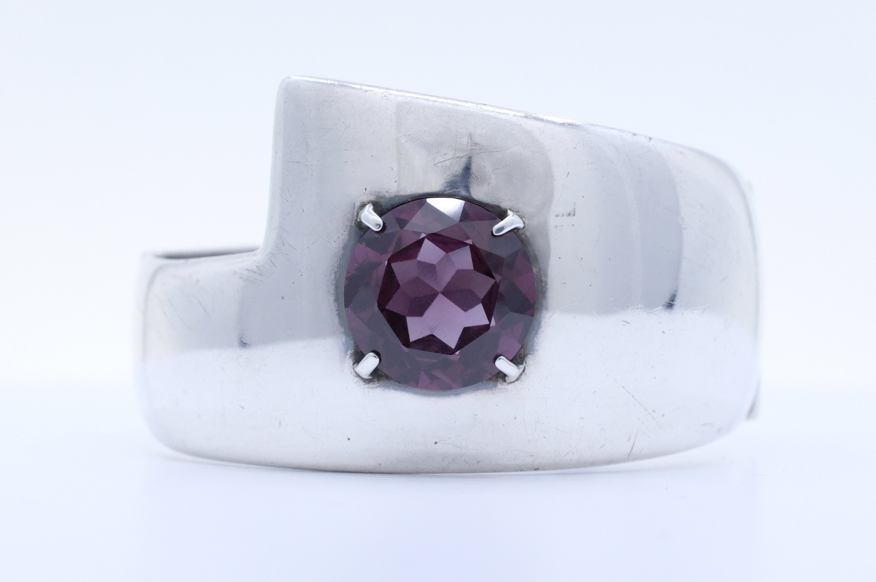 Crafted in gleaming solid sterling silver, the bracelet features a bold asymmetric modernist design. Its dynamic form is both sculptural and wearable, showcasing the innovative spirit that defines the Pineda name. At its heart rests a stunning faceted amethyst, a burst of regal purple that captures and refracts the light with every movement. The stone is securely and elegantly set, allowing it to be the captivating focal point.