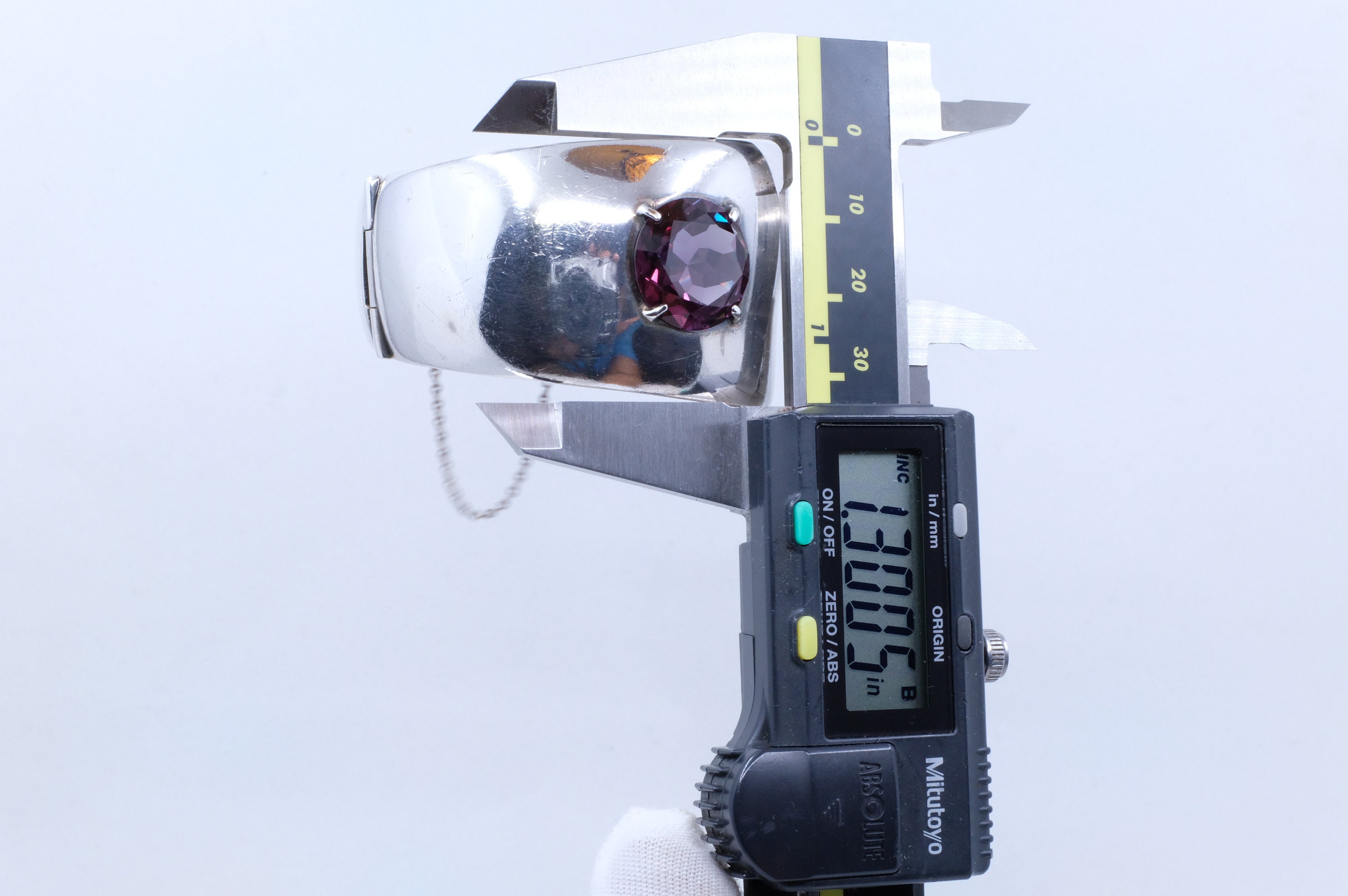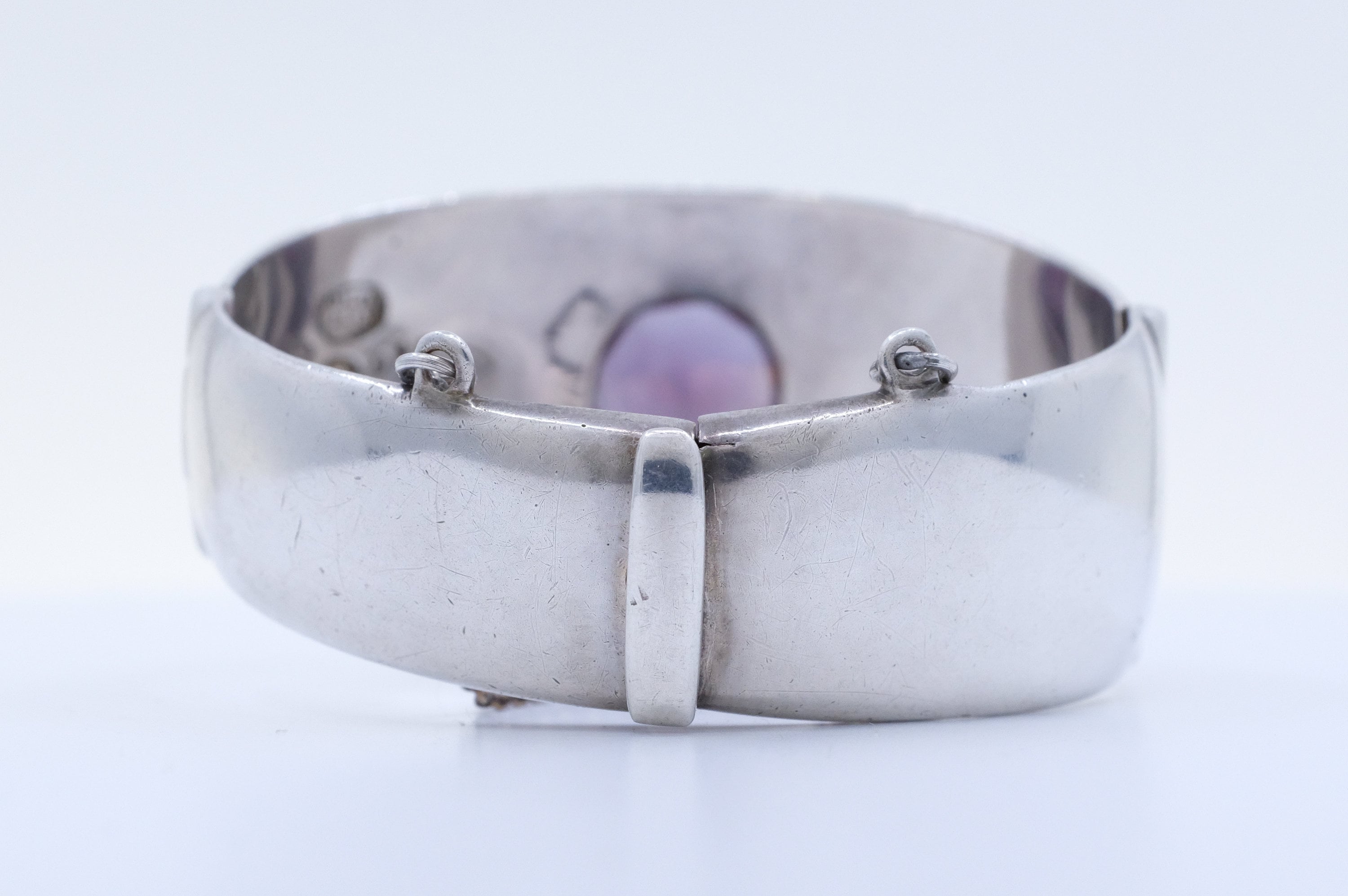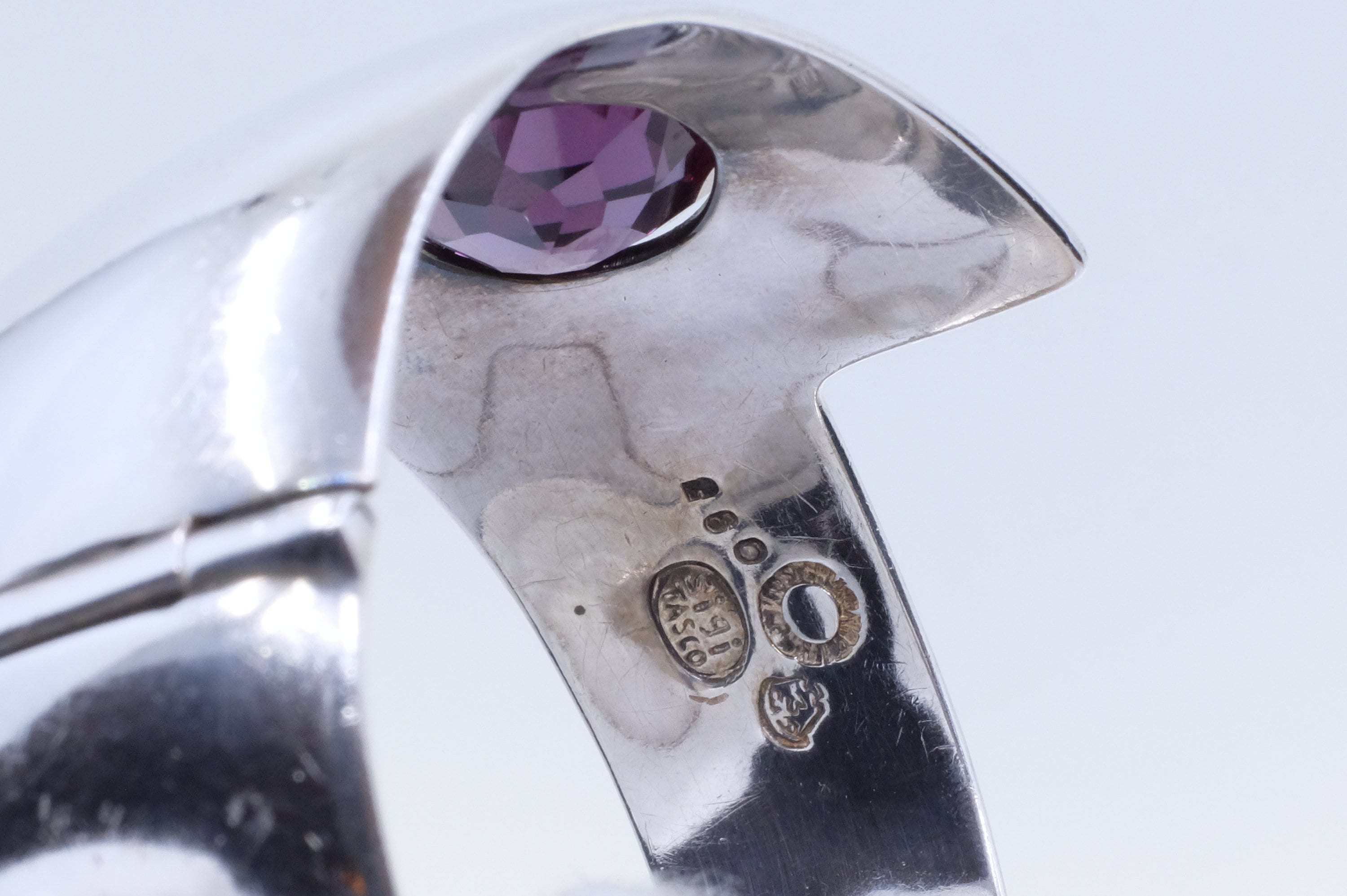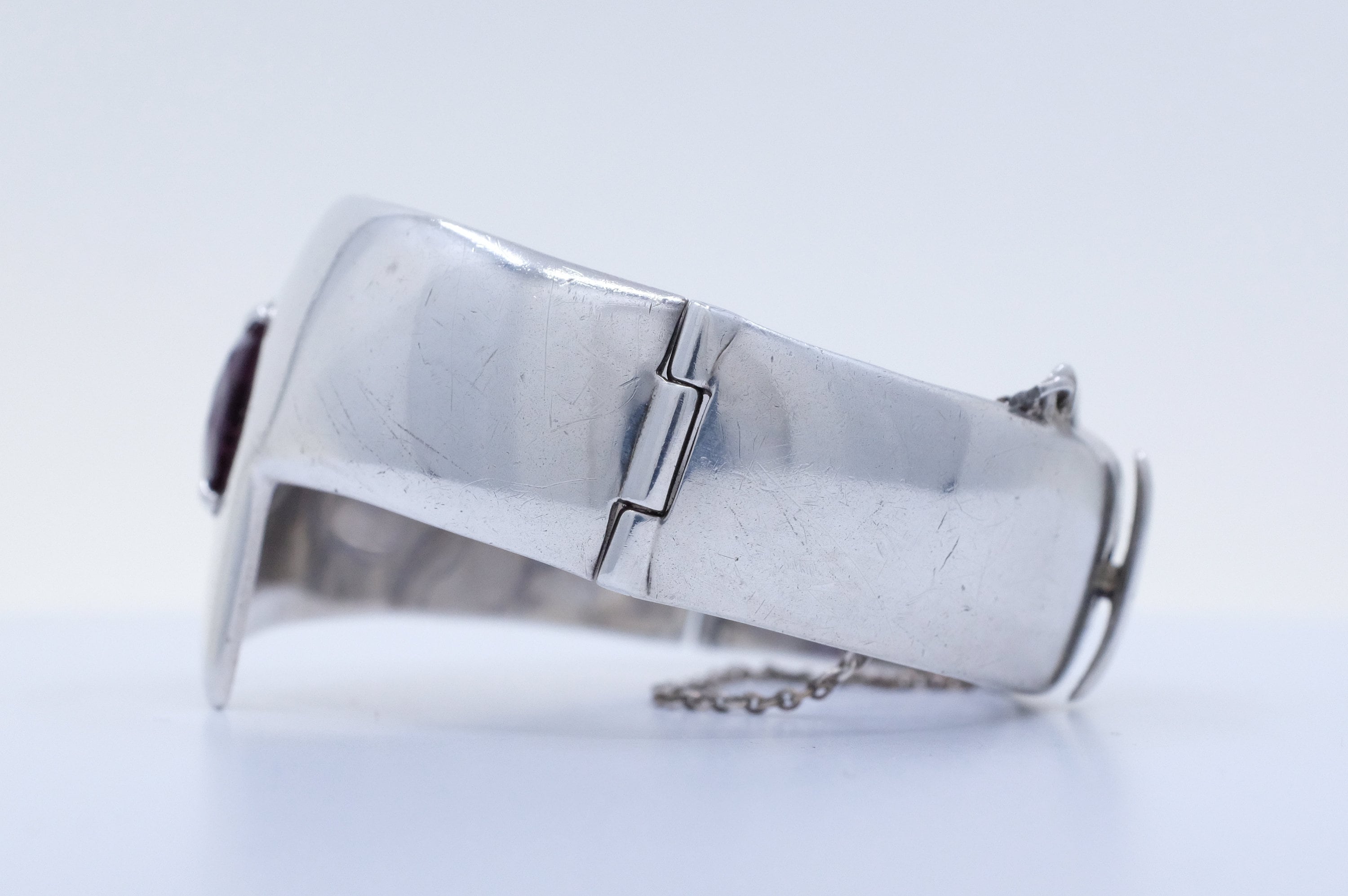 Crafted in gleaming solid sterling silver, the bracelet features a bold asymmetric modernist design. Its dynamic form is both sculptural and wearable, showcasing the innovative spirit that defines the Pineda name. At its heart rests a stunning faceted amethyst, a burst of regal purple that captures and refracts the light with every movement. The stone is securely and elegantly set, allowing it to be the captivating focal point.