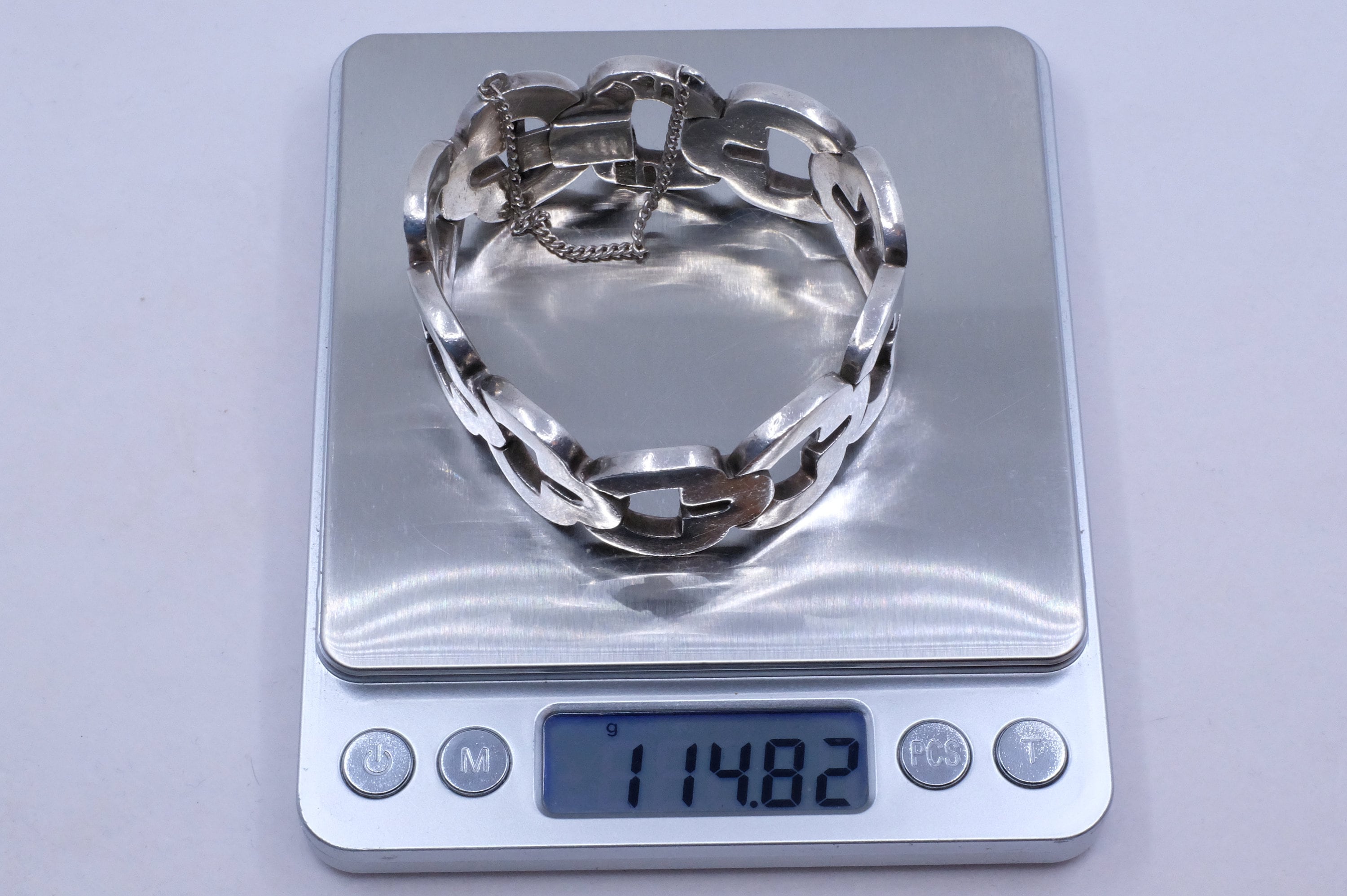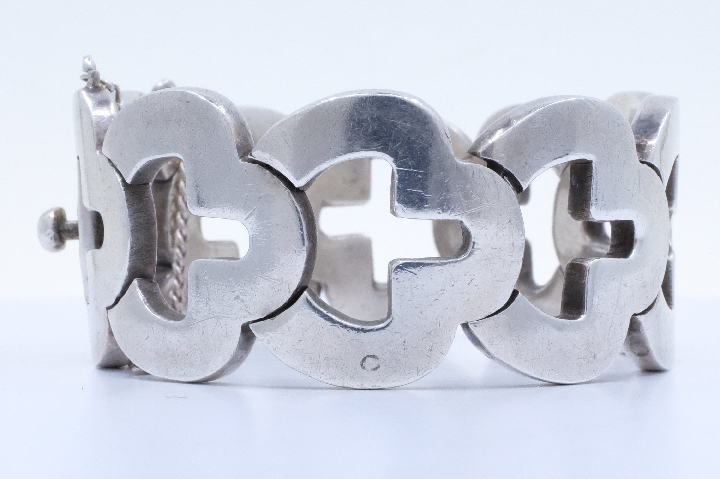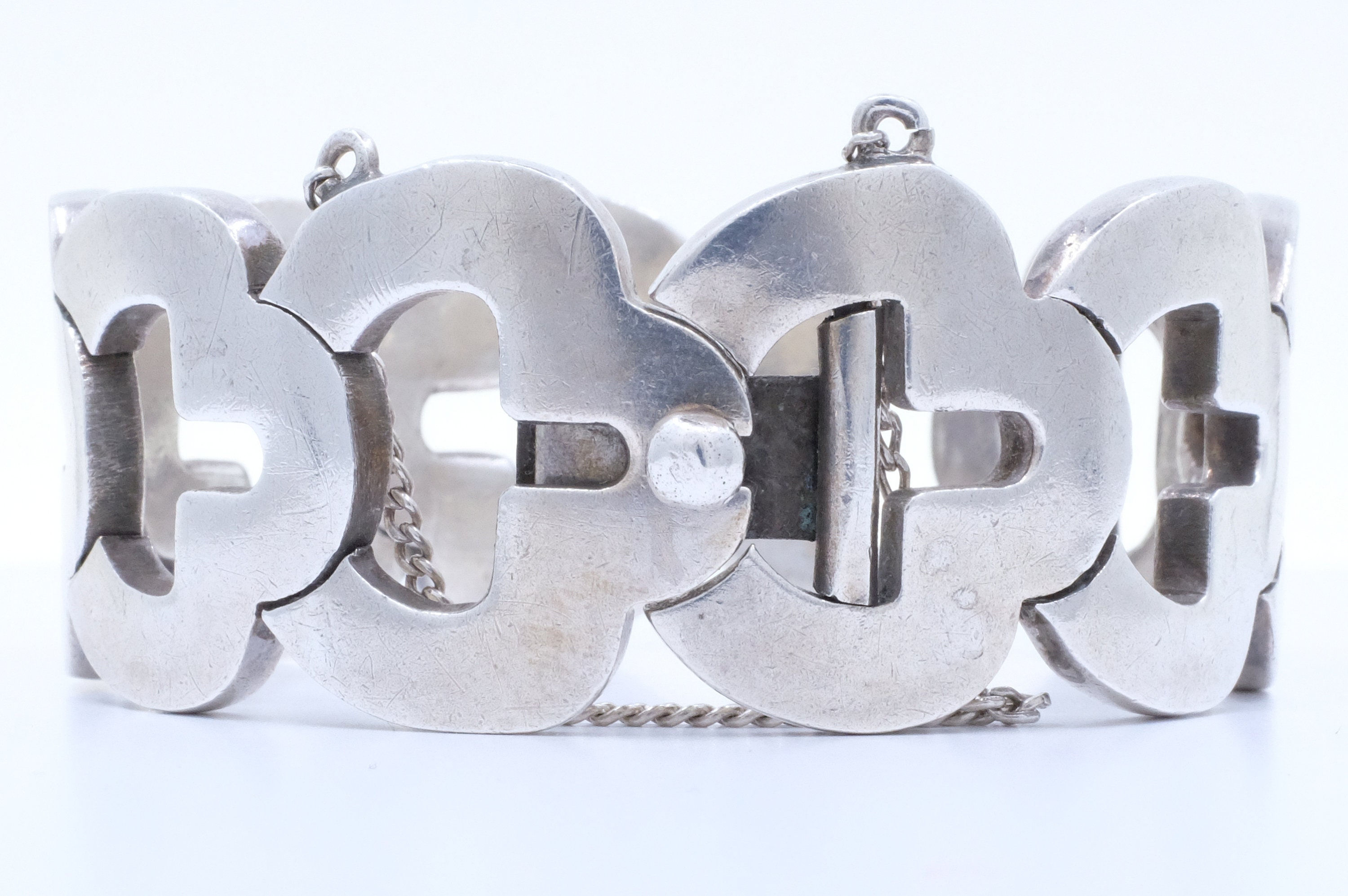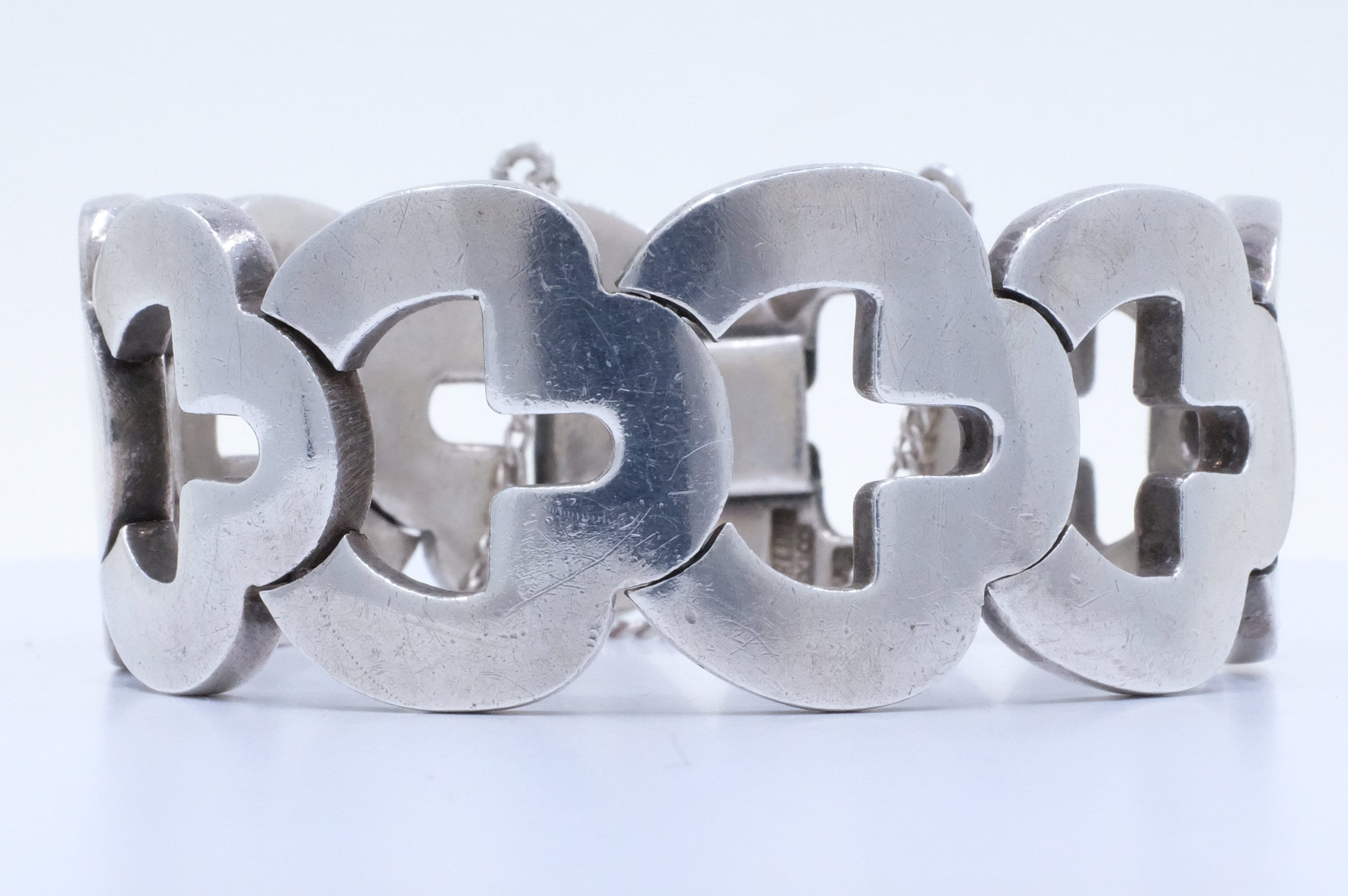 If there is someone whom I wish I could interview, it would be maestro Antonio Pineda. His designs are some of the most imaginative and enduring sterling silver jewelry designs of the last 100 years. He was primarily a modernist jewelry designer. We're lucky to have come across just one of his designs. This sophisticated modernist bracelet features concave articulated wedges. In my mind, it's a silver sculpture that you get to wear. A person who designs in this way really reveres the wearer. I am so lucky to be able to share it with you.