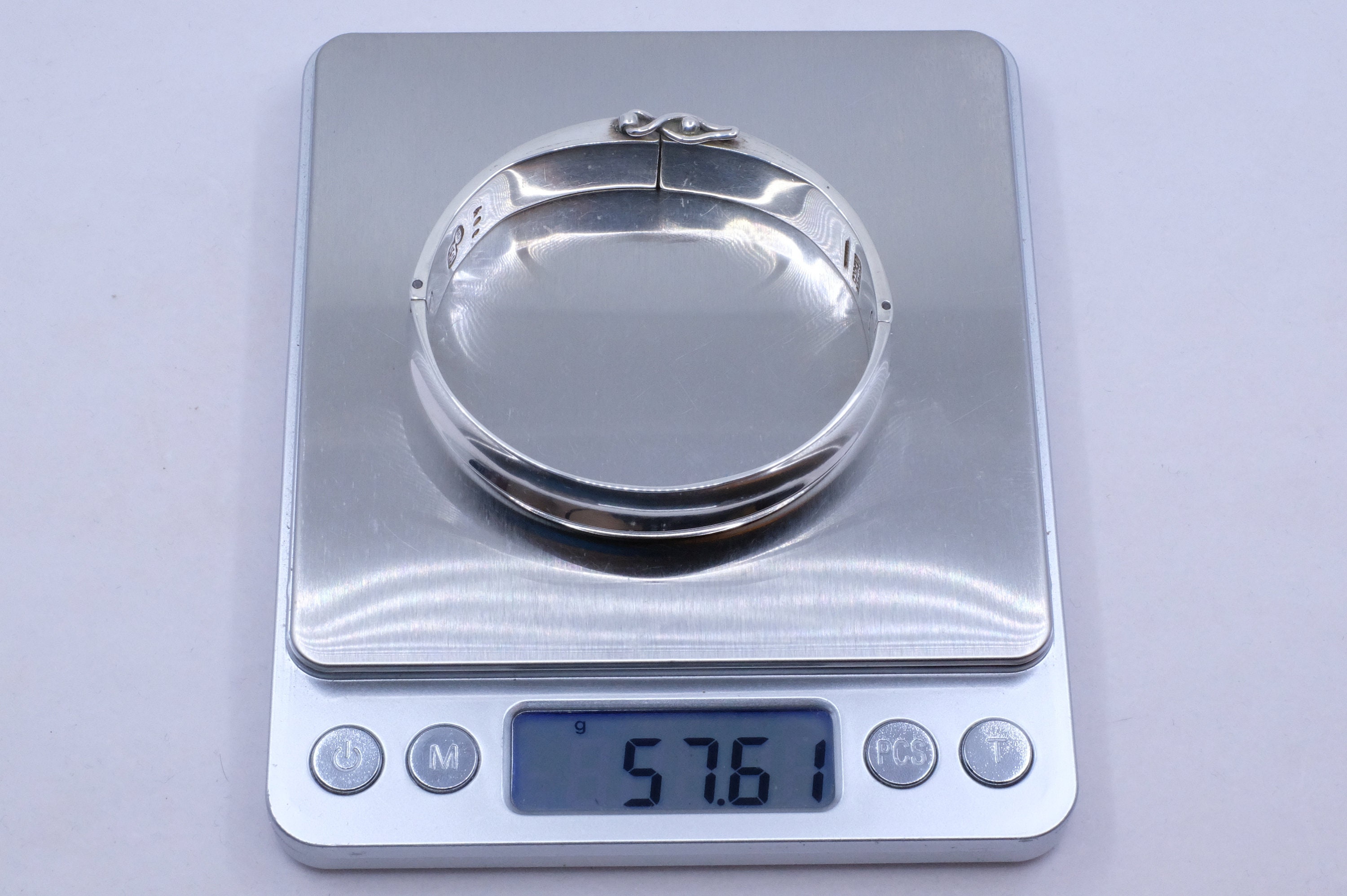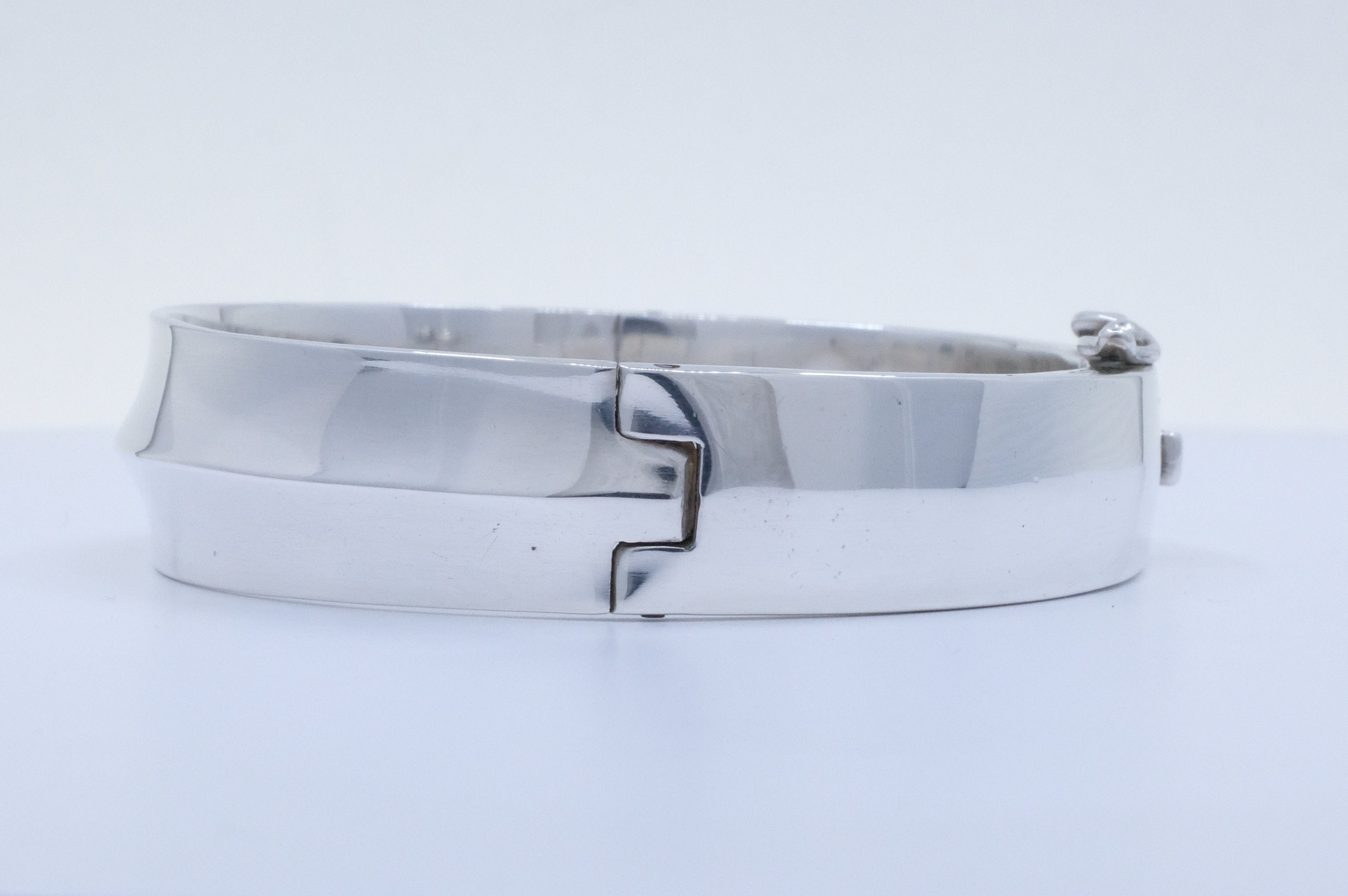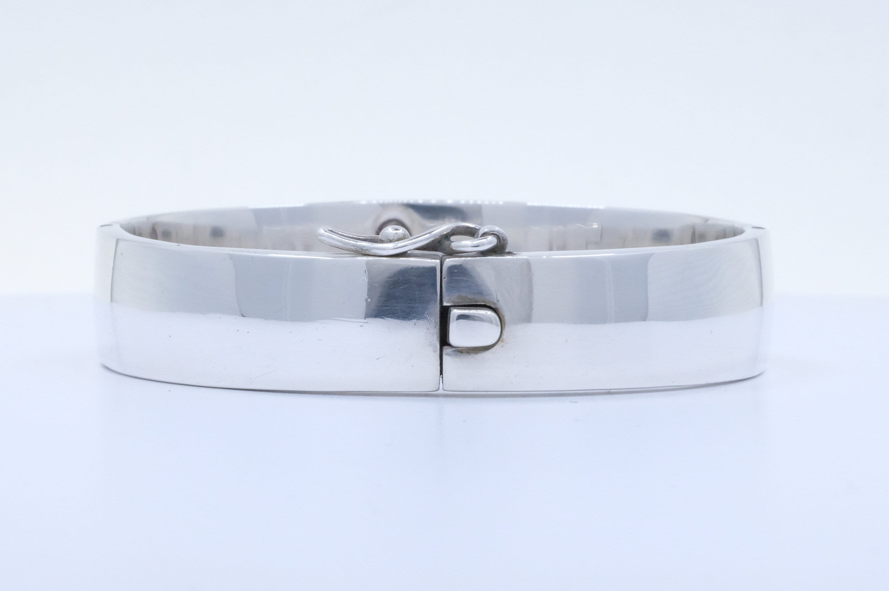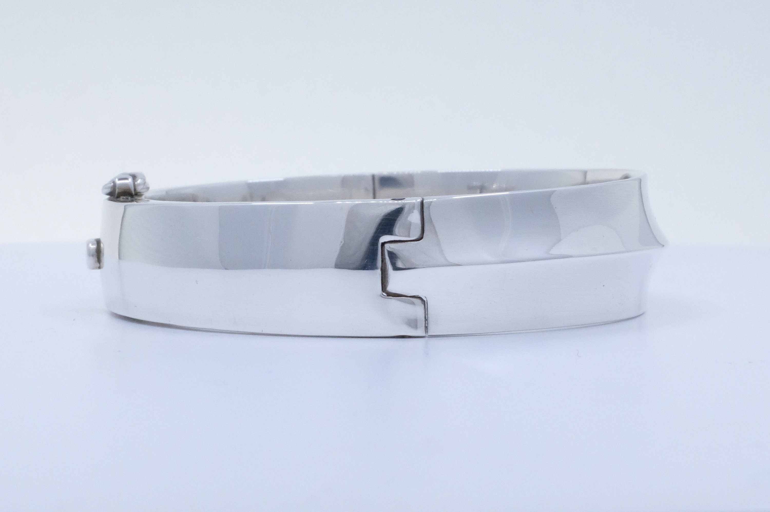 Discover a piece of wearable art history. Crafted in solid sterling silver by Sigi Pineda, the bracelet's allure is in its sophisticated simplicity. The sleek, clean lines and flawless hinged design offer a timeless versatility while effortlessly transitioning from your everyday uniform to evening elegance. The secure hinge ensures a perfect, comfortable fit every time you wear it.
