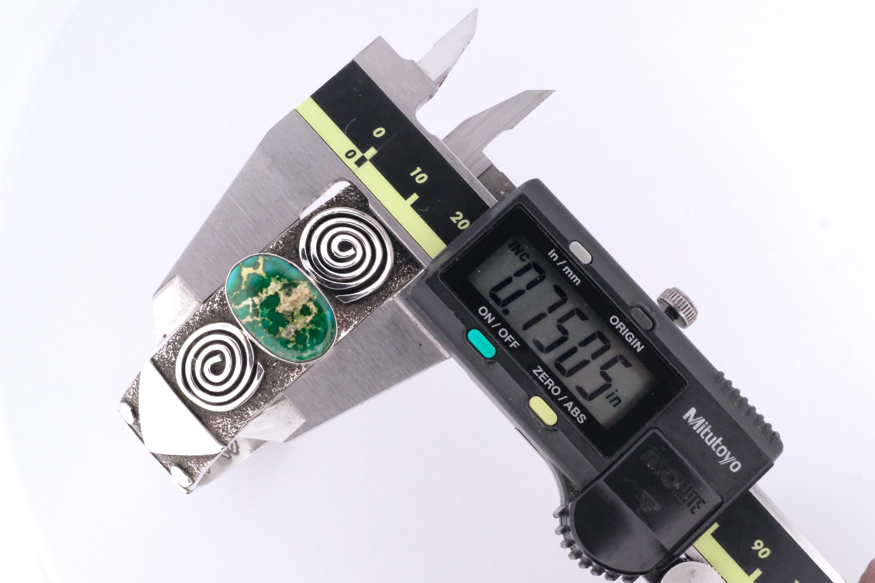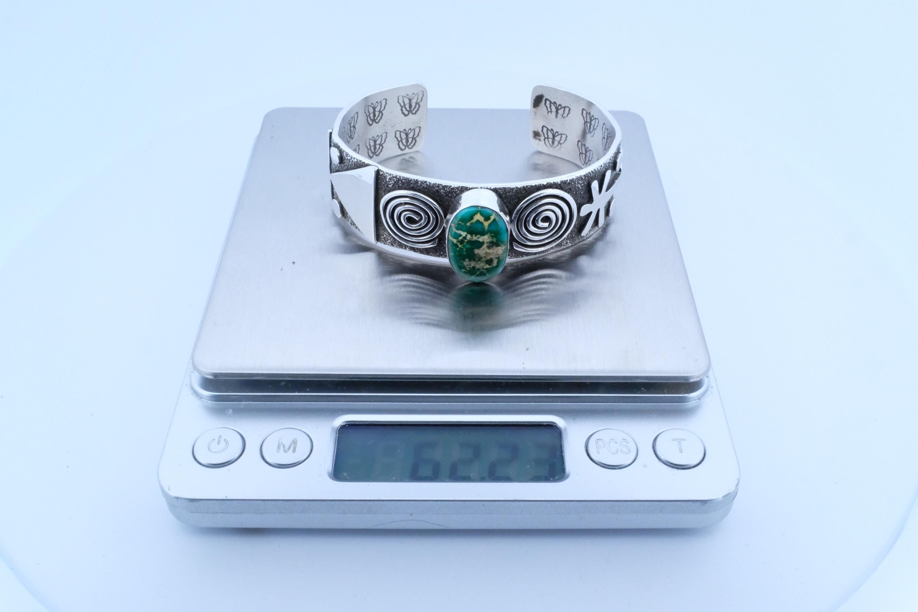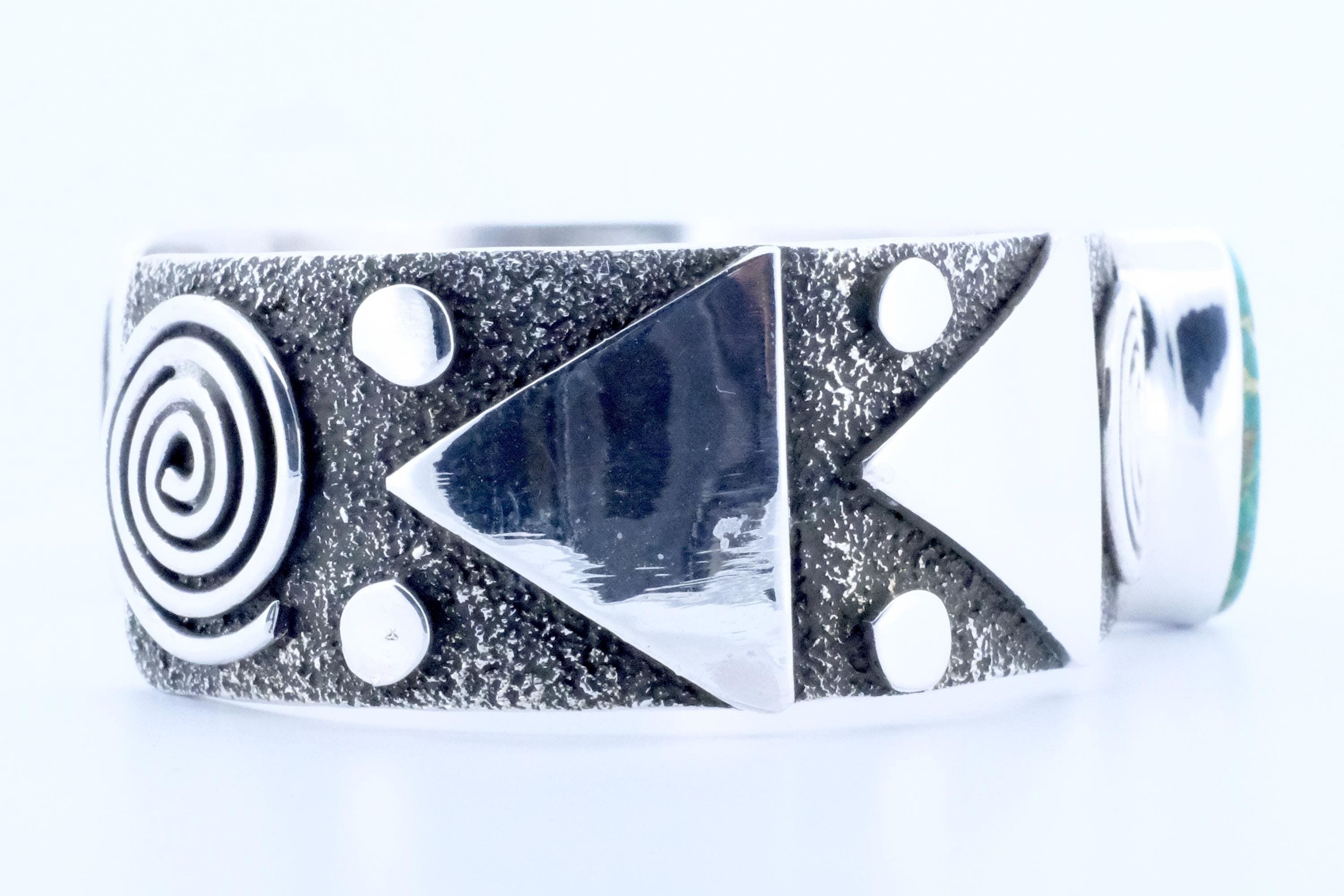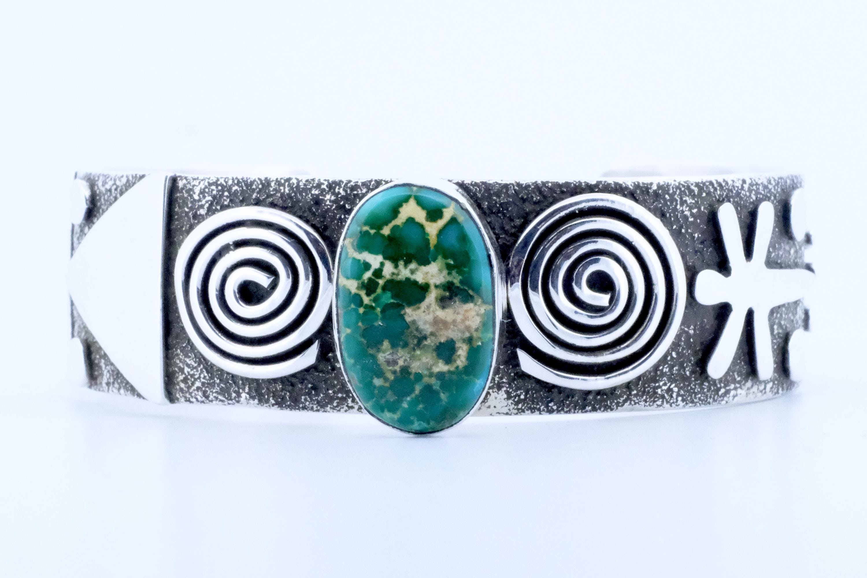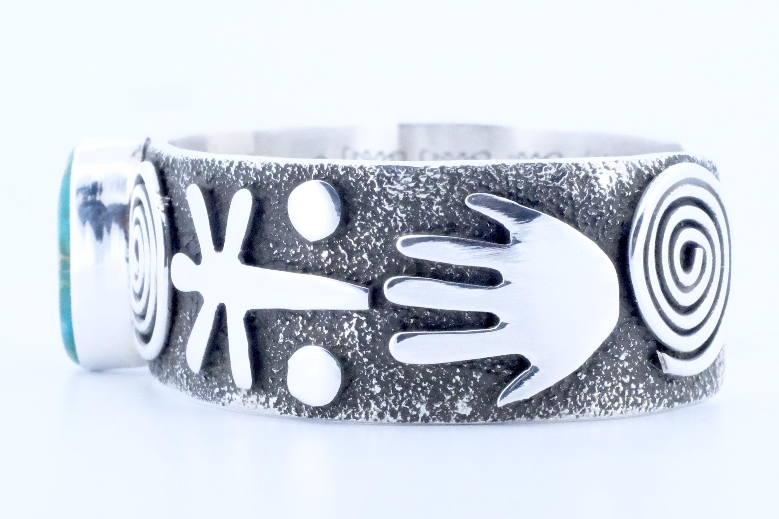 Sterling Silver Sonoran Gold Turquoise Alex Sanchez Navajo Petroglyph Cuff Bracelet 3/4 in.