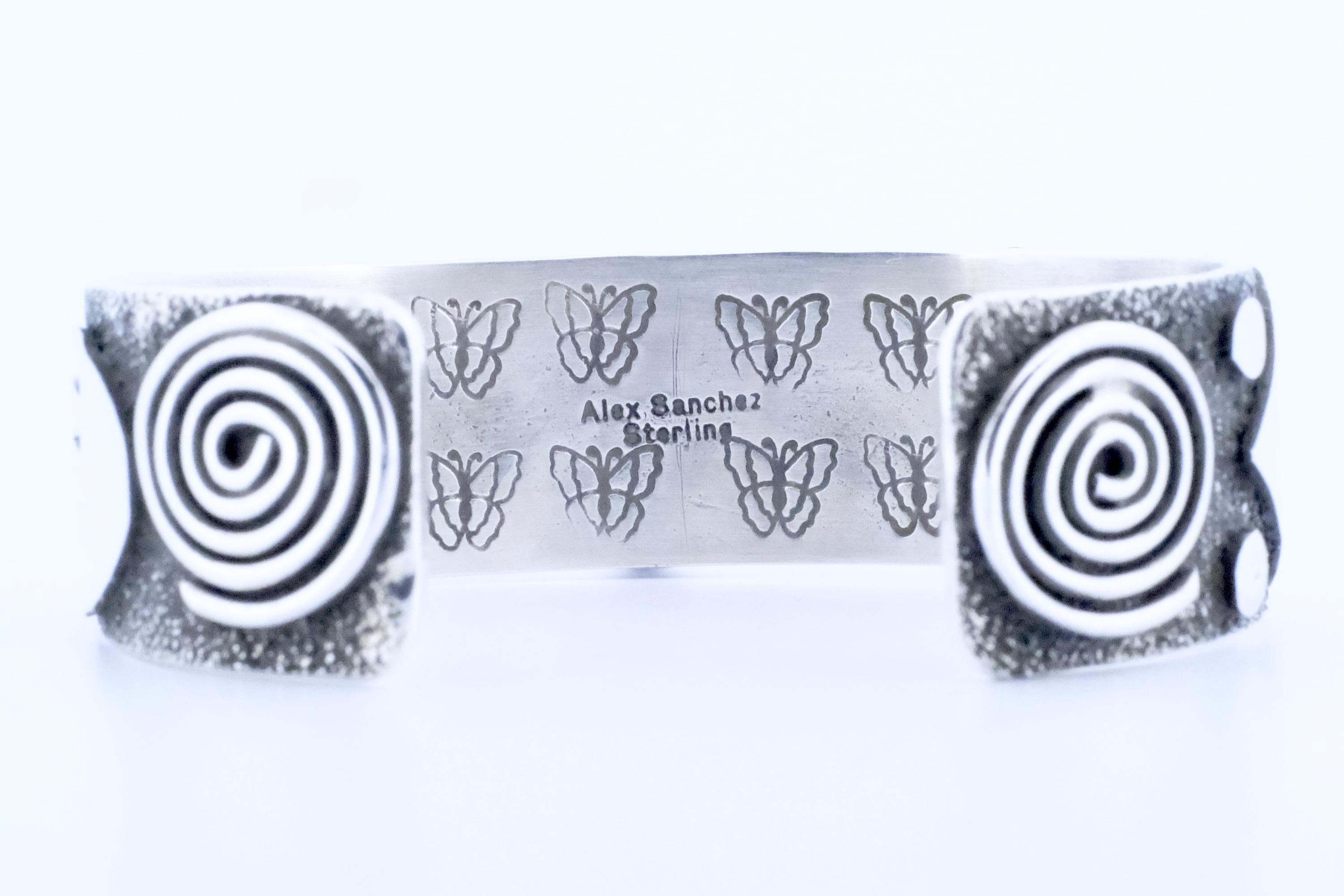 When it comes to sterling silver petroglyphs, there's no one quite like Alex Sanchez. He is of both Navajo and Zuni traditions and his exquisite creations transcend the boundaries of conventional jewelry, reaching a level that can only be described as legendary. Prepare to be captivated by the sheer brilliance and charm radiating from his masterpieces. A harmonious fusion of delight and magnificence graces each piece, an extraordinary feat that requires immense skill and finesse.