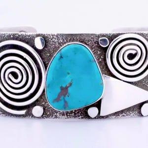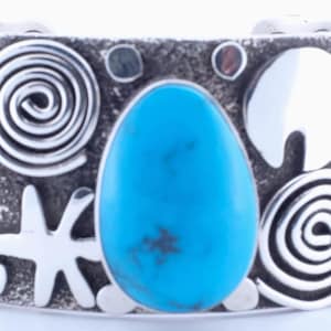 But that's not all – these remarkable works of art often possess a weighty turquoise presence that demands attention. Imagine the moment you step into a room, and all eyes turn toward you. With Alex Sanchez's petroglyph jewelry adorning your being, there's no need for words – it speaks volumes on your behalf. Prepare to make an indelible statement that resonates with strength and sophistication.