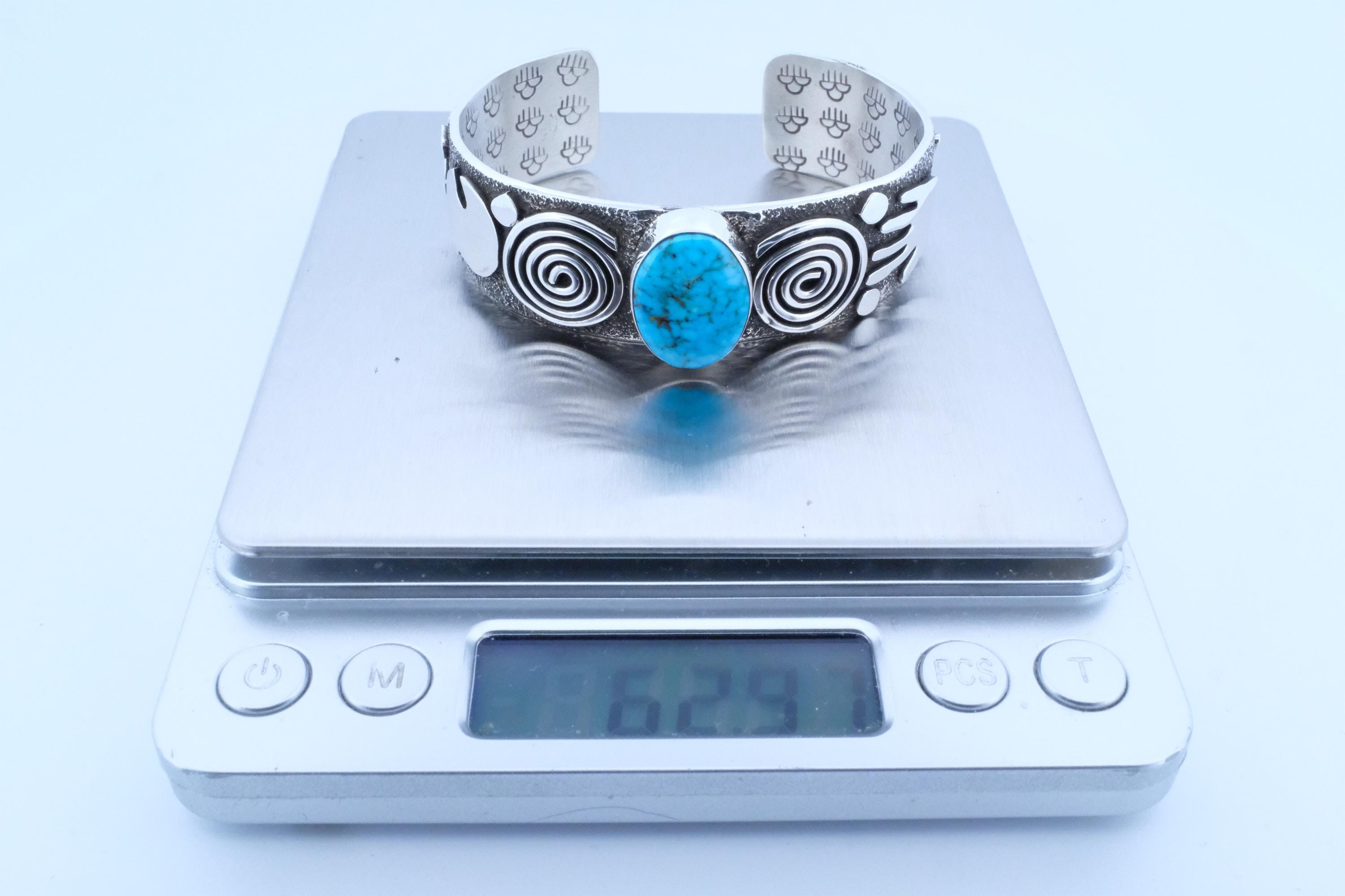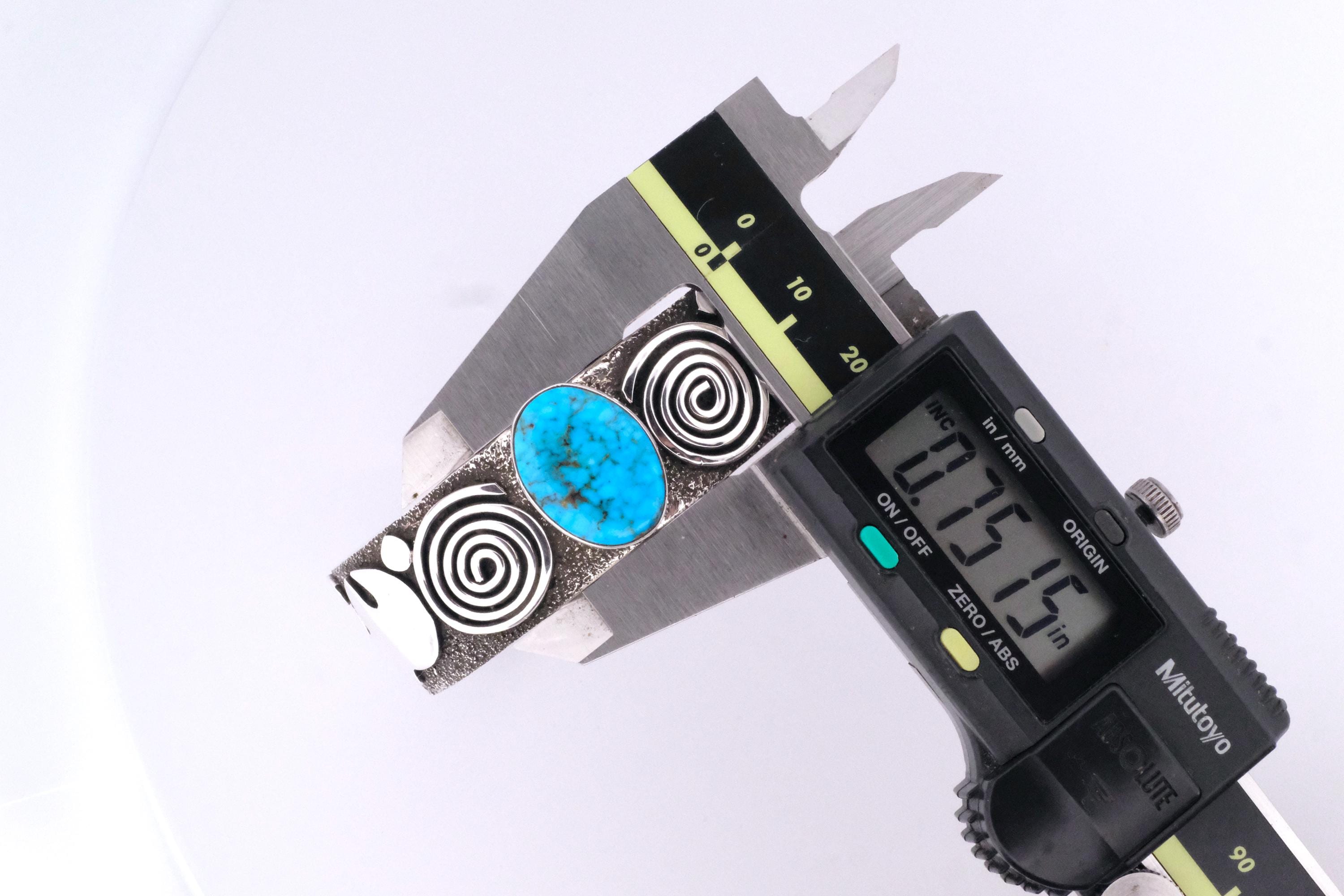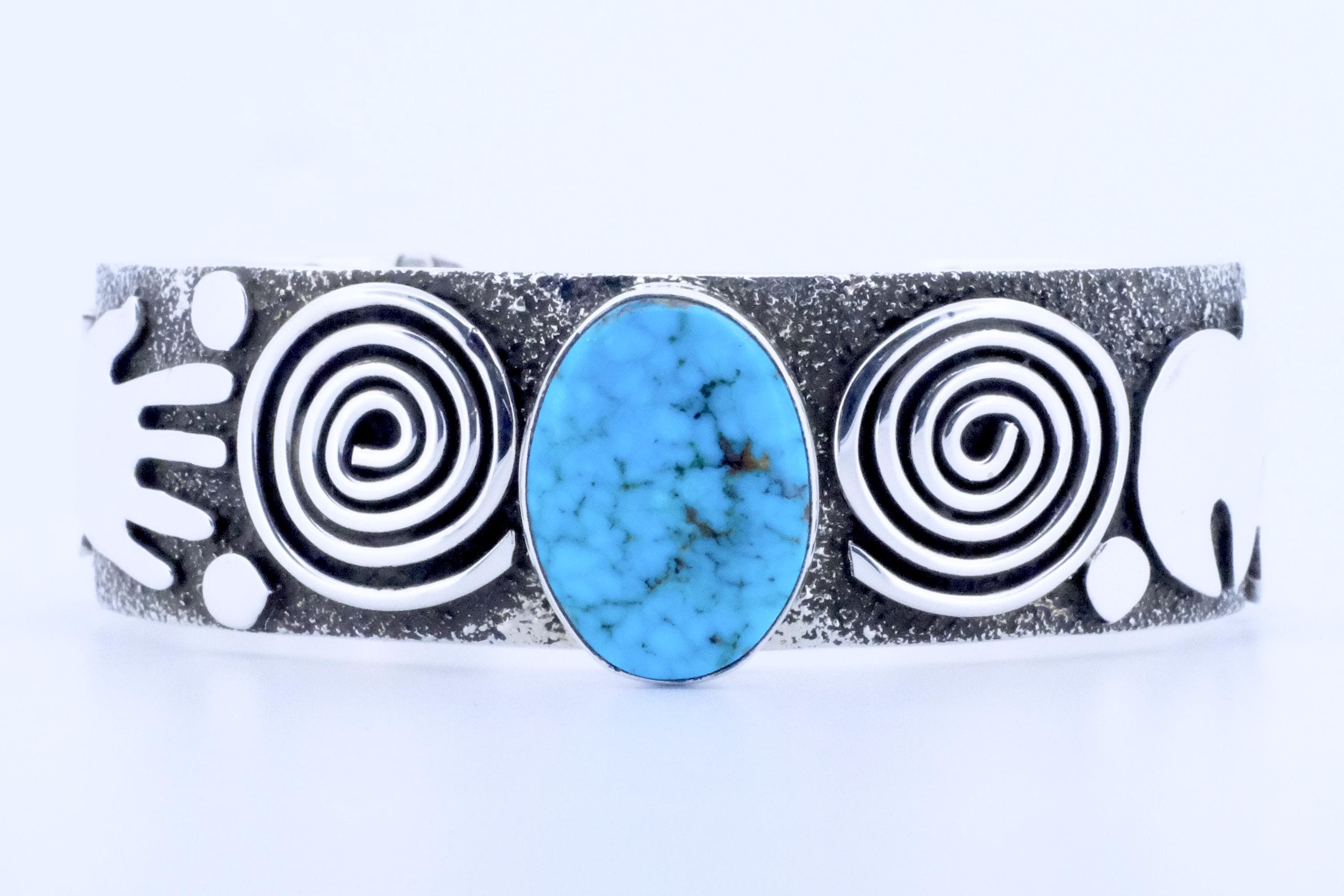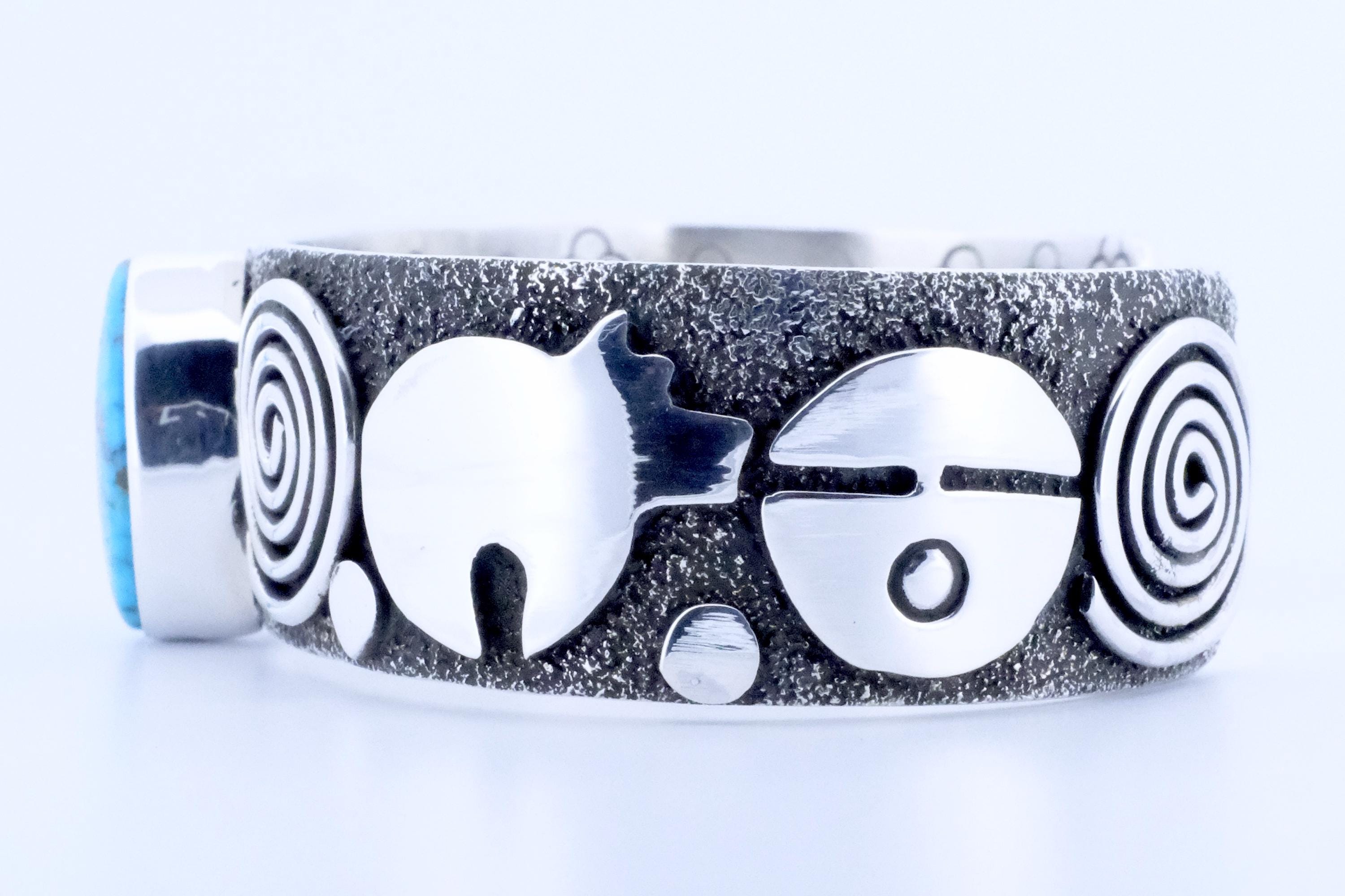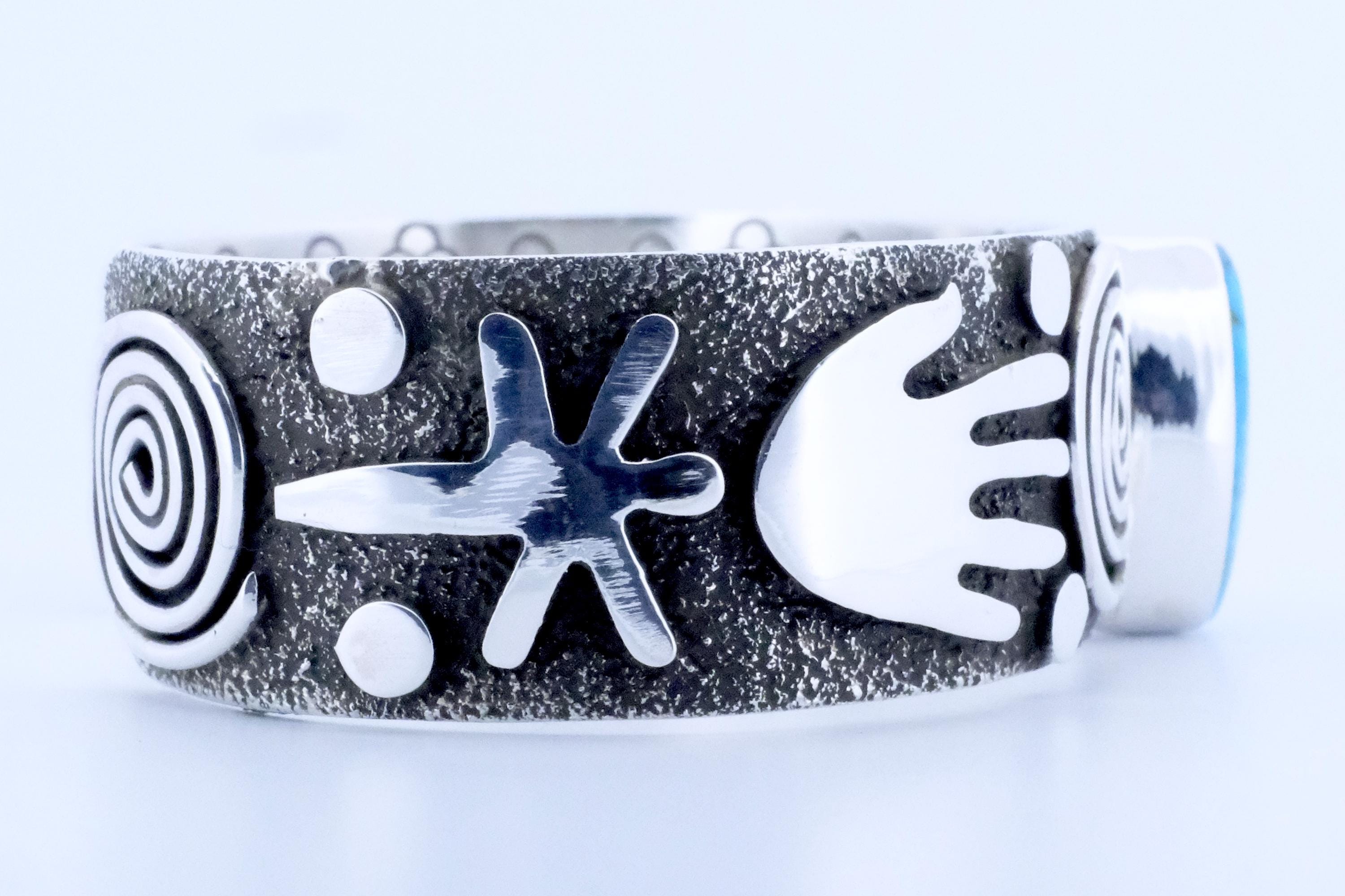 Sterling Silver Birdseye Kingman Turquoise Alex Sanchez Navajo Petroglyph Cuff Bracelet 3/4 in.