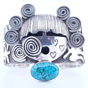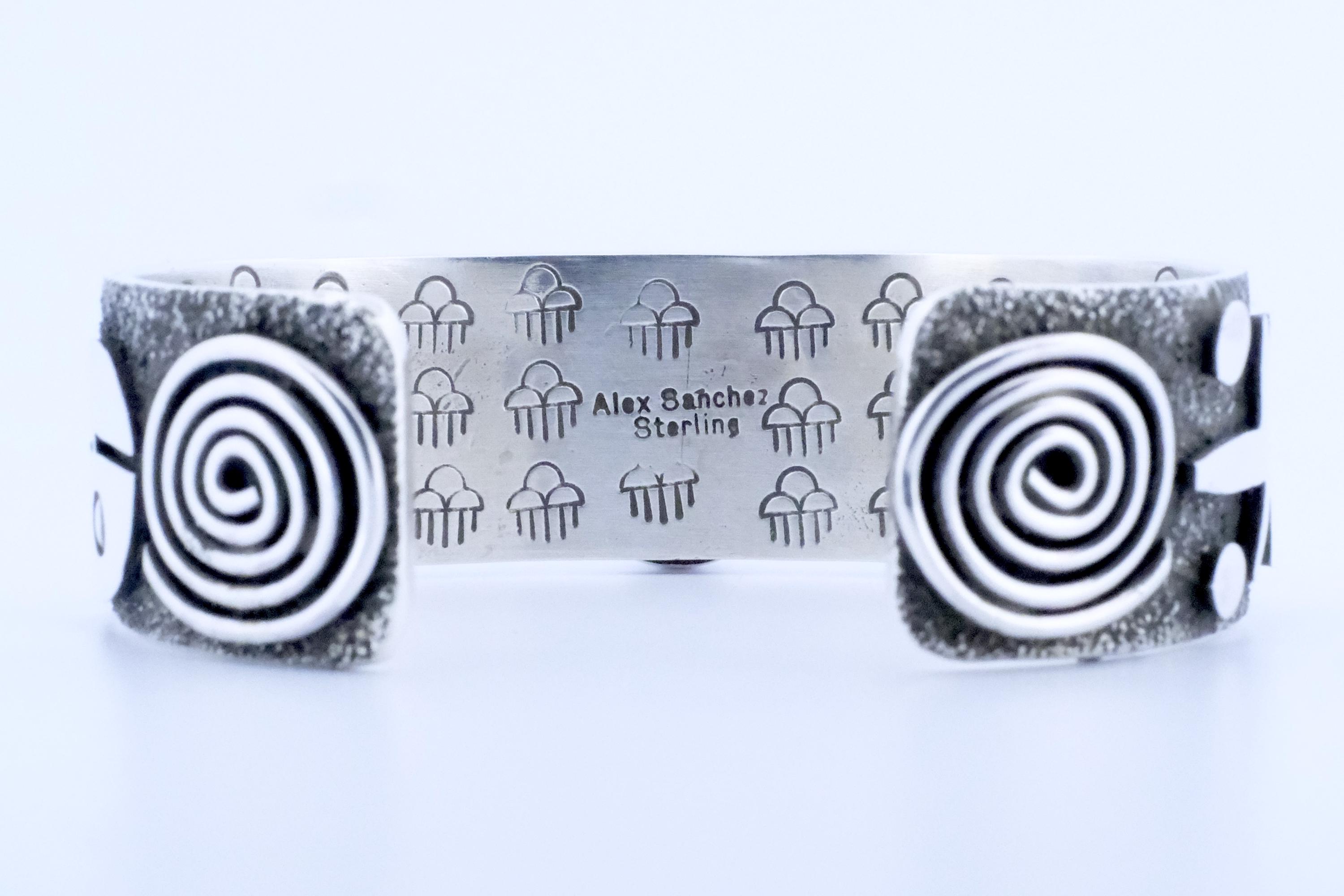 When it comes to sterling silver petroglyphs, there's no one quite like Alex Sanchez. He is of both Navajo and Zuni traditions and his exquisite creations transcend the boundaries of conventional jewelry, reaching a level that can only be described as legendary. Prepare to be captivated by the sheer brilliance and charm radiating from his masterpieces. A harmonious fusion of delight and magnificence graces each piece, an extraordinary feat that requires immense skill and finesse.