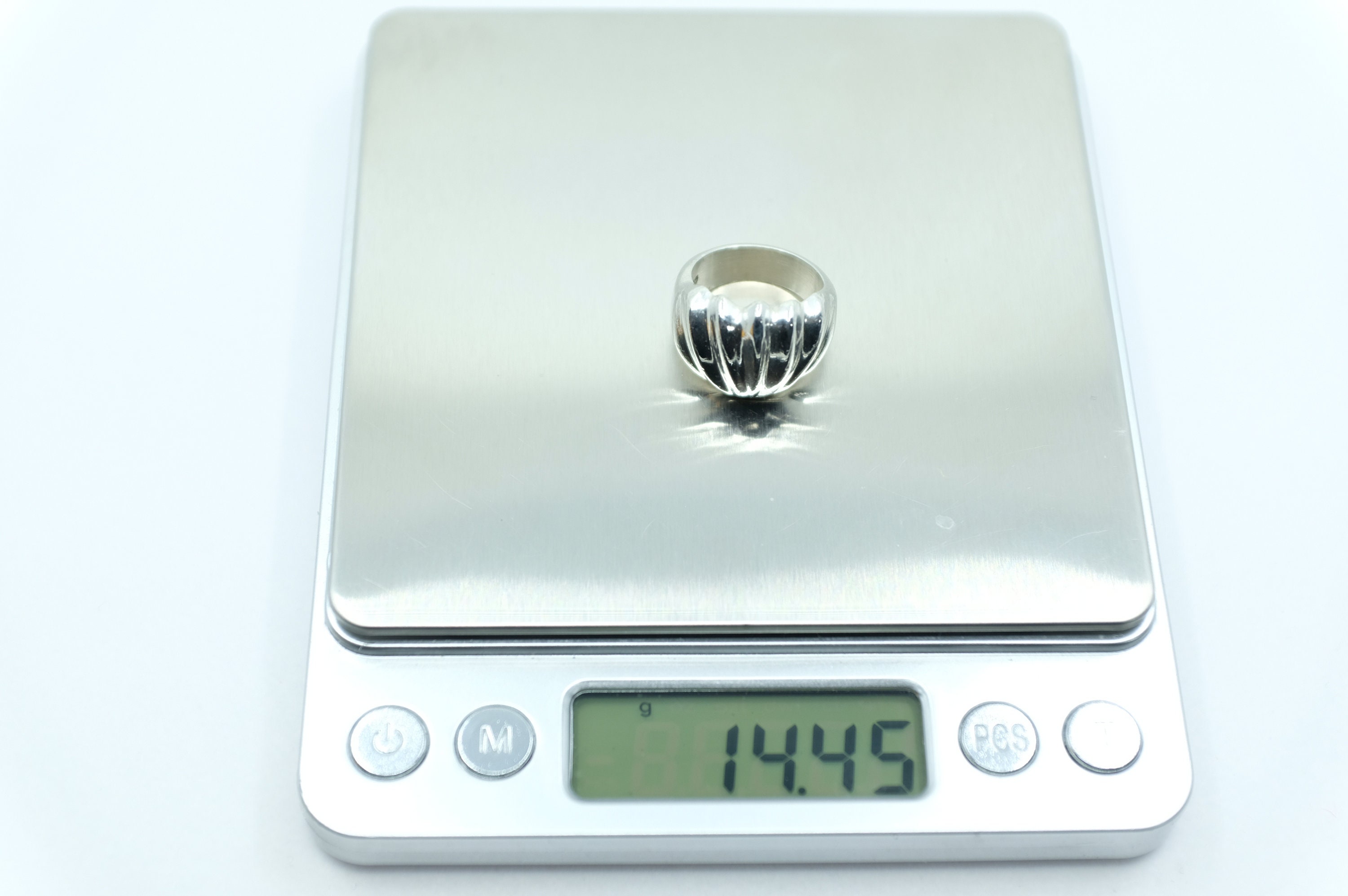 This is a modern sterling silver ring. What inspired its shape? Was it sun rays? A clamshell? A crown? Whatever the inspiration, it resulted in this beautiful piece of jewelry. Its contours on the ring are smooth. The profile is royal. We love these rings and what they add to our chic style.