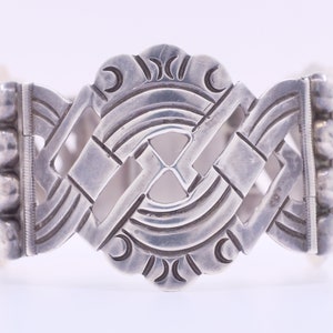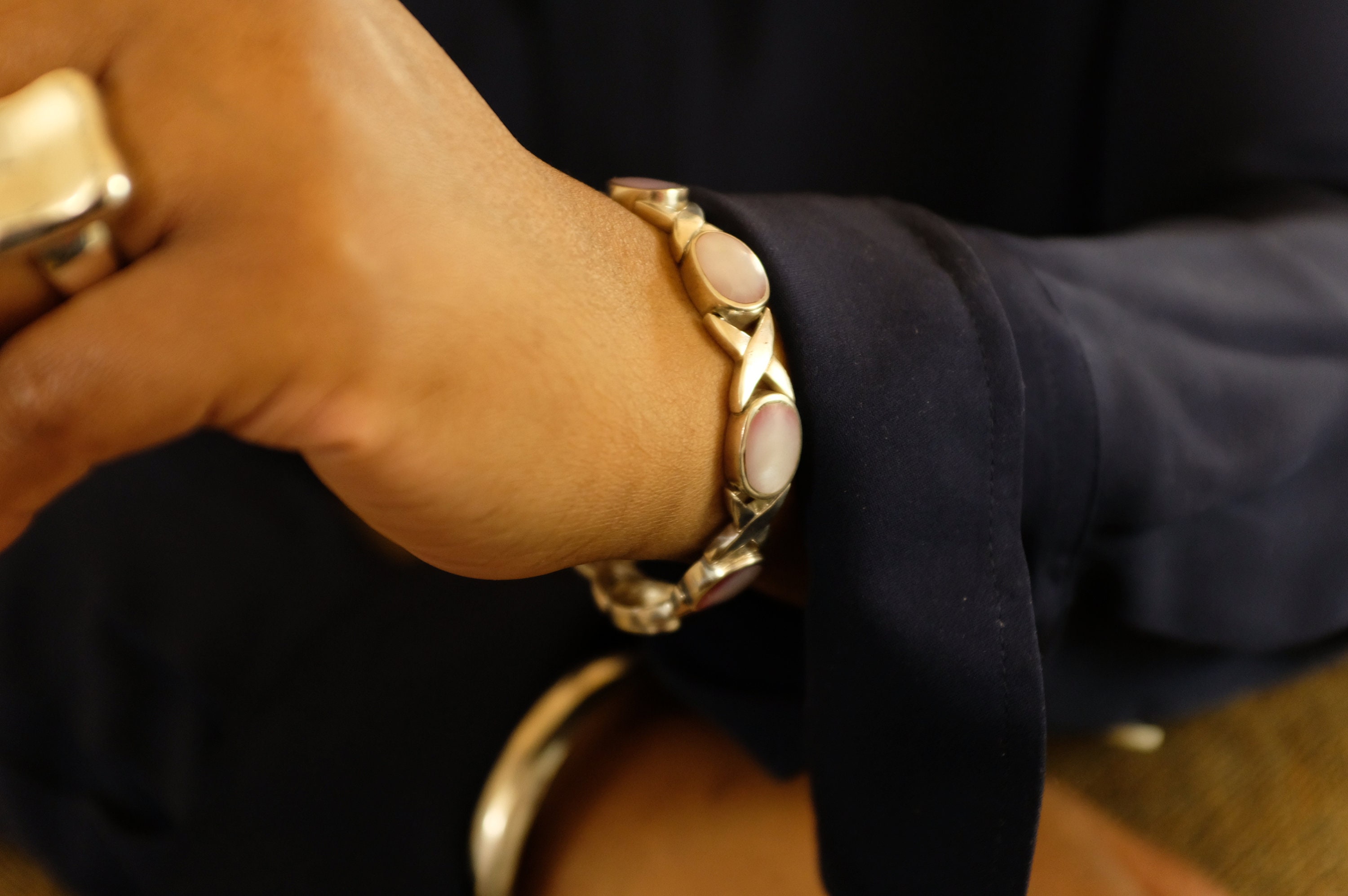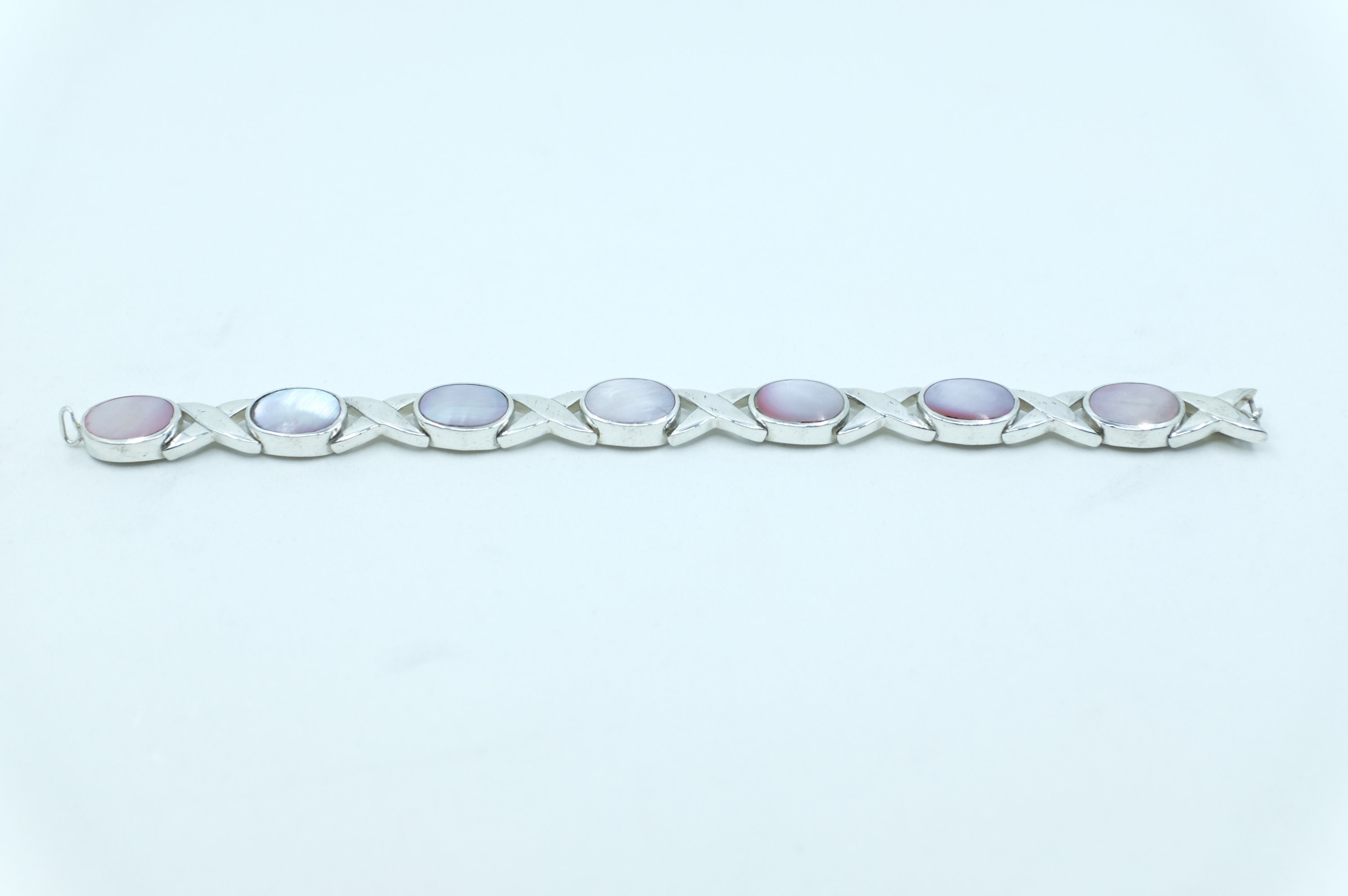 A vintage pink mother of pearl set in sterling silver settings? What a unique discovery. A bracelet like this one may start a conversation, but that's okay. It's sure to be a pleasant one. You might mention it's vintage craftmanship, or you may recieve a compliment regarding the lusterous blush of your mother of pearl gems.