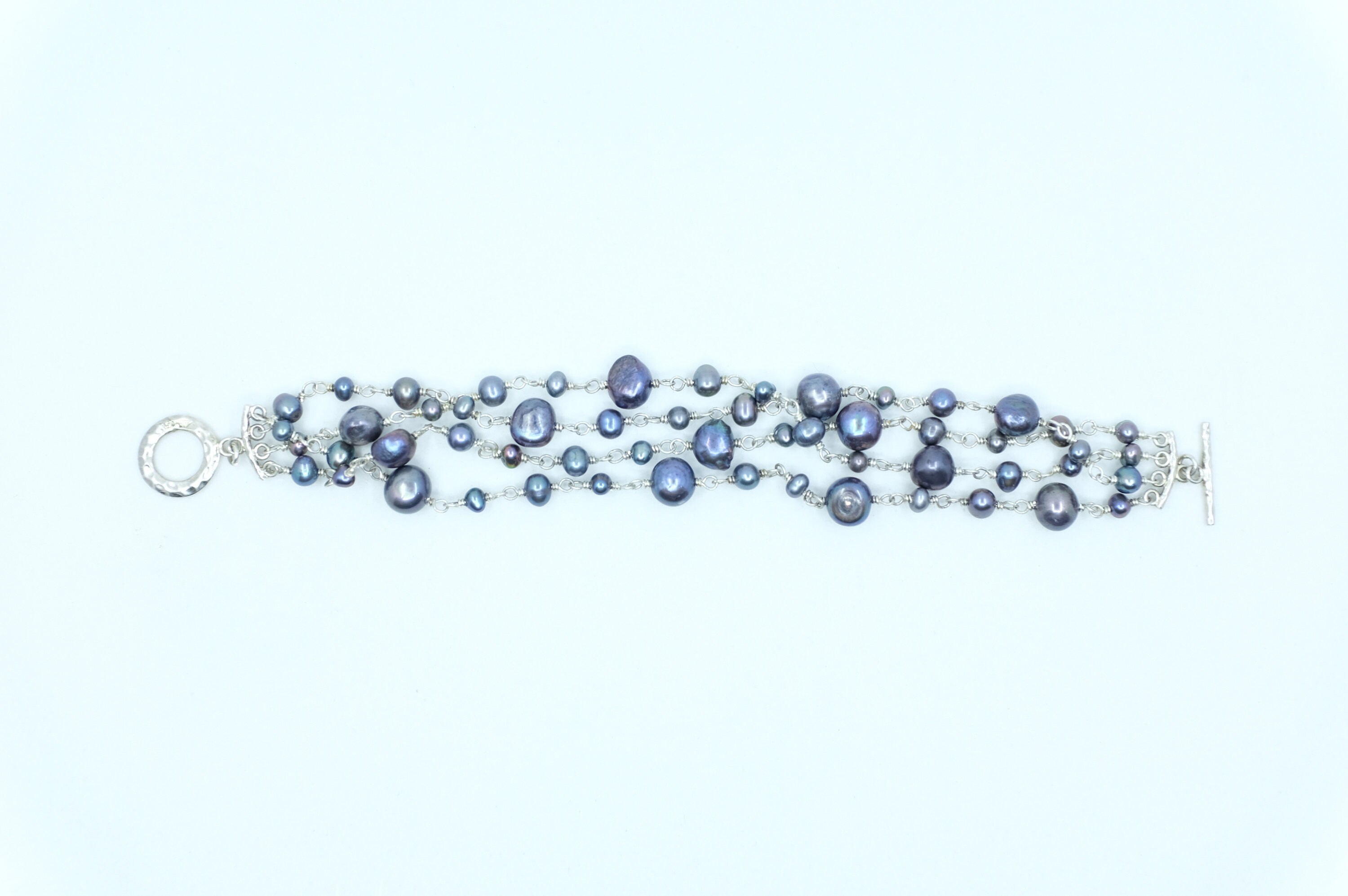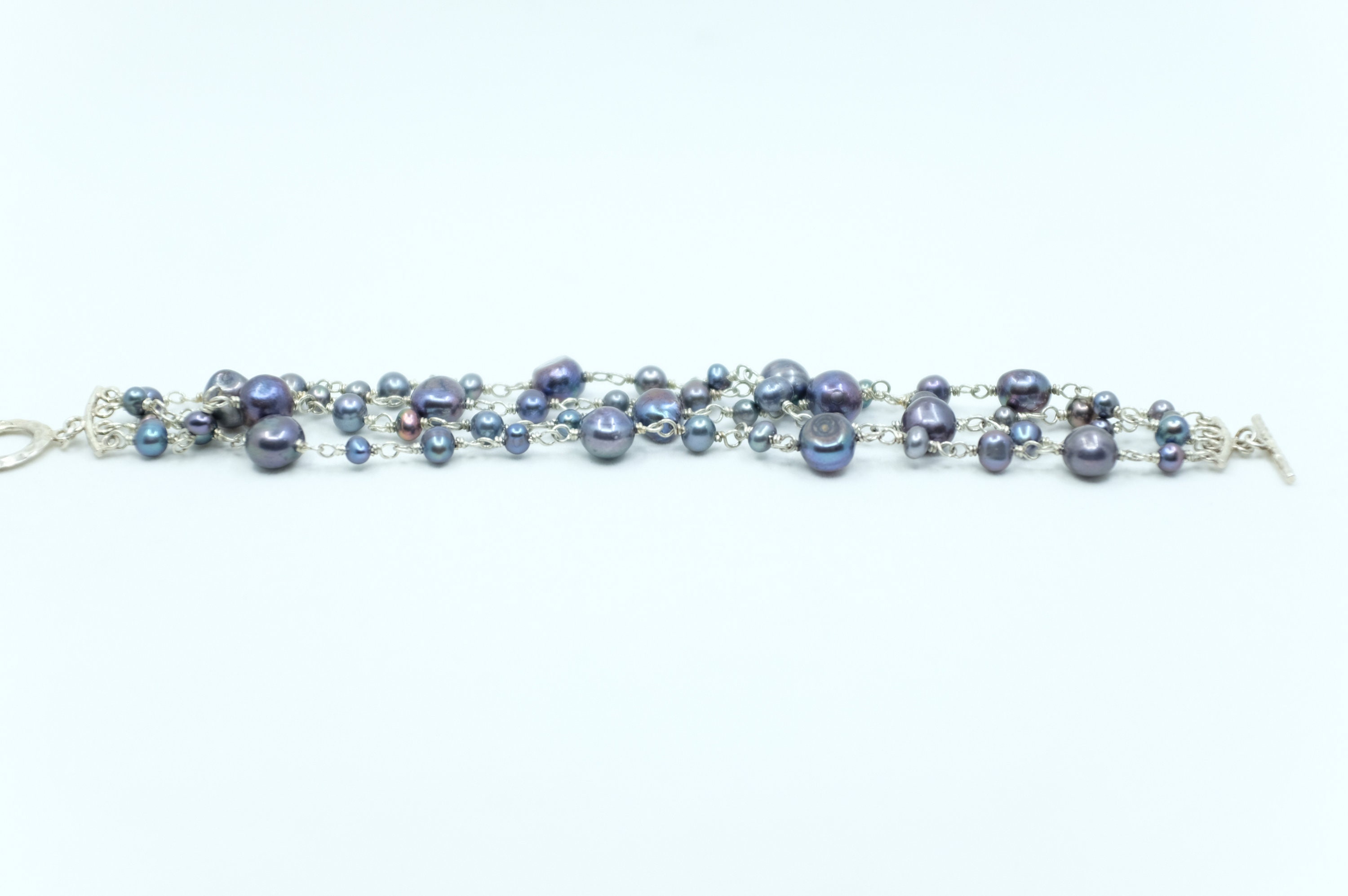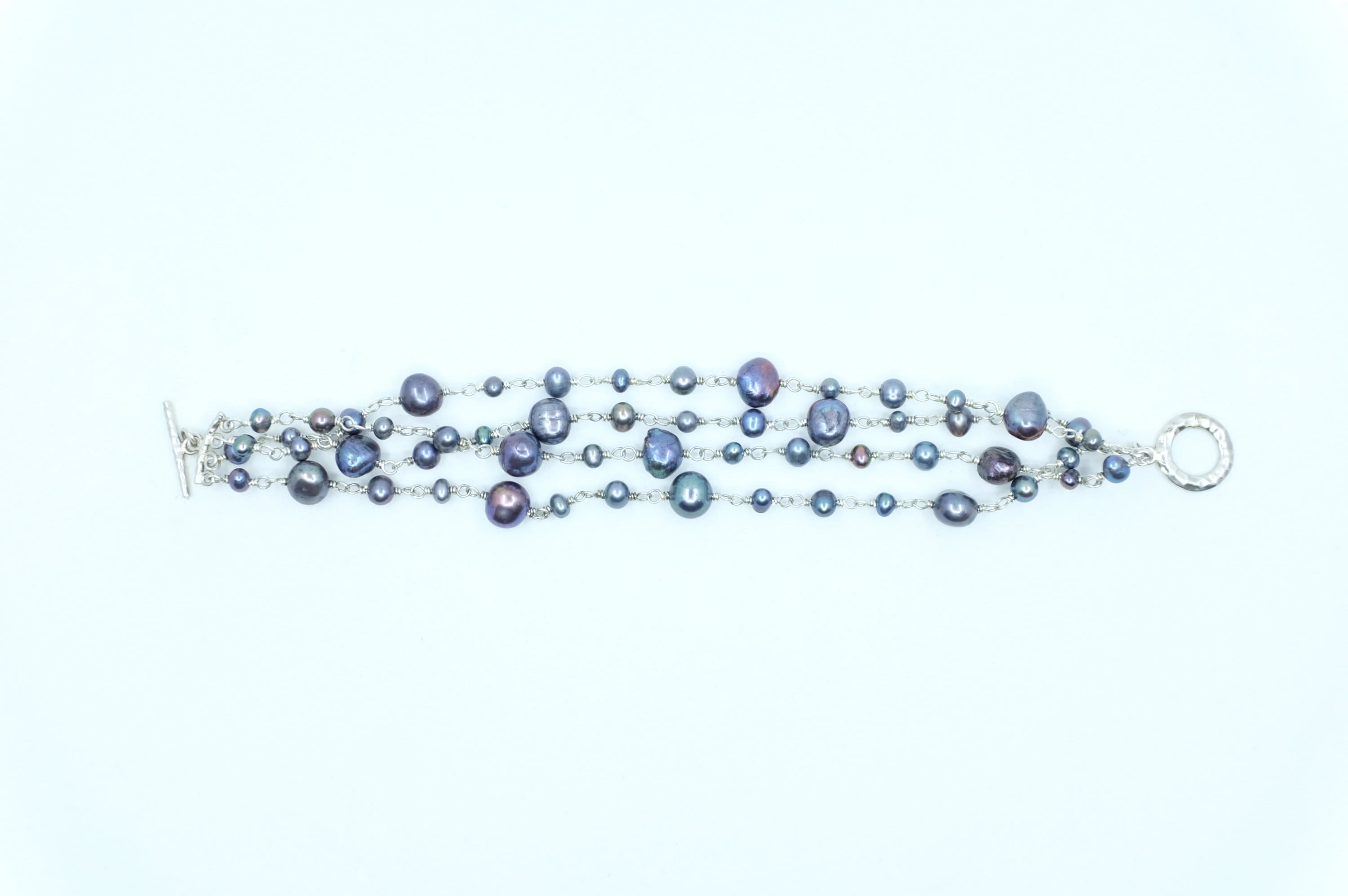 This bracelet features a contemporary design, where organic, baroque freshwater black pearls in mesmerizing peacock hues (shifting from deep indigo to emerald and charcoal) are lovingly hand-selected and spaced on a luxurious sterling silver chain with a toggle clasp. No two pearls are alike: their natural, one-of-a-kind baroque shapes and subtle size variations ensure your bracelet is utterly unique…just like you.