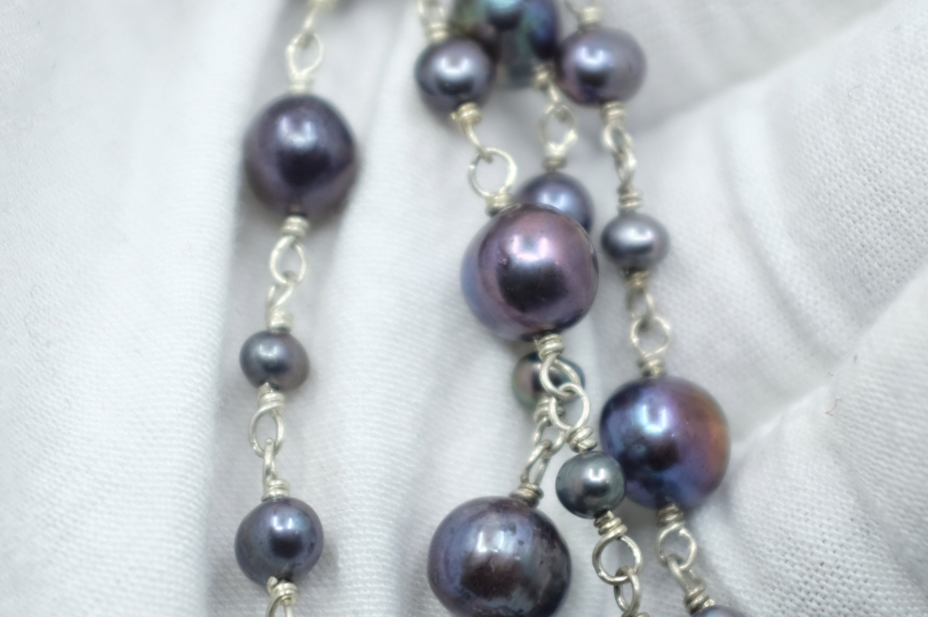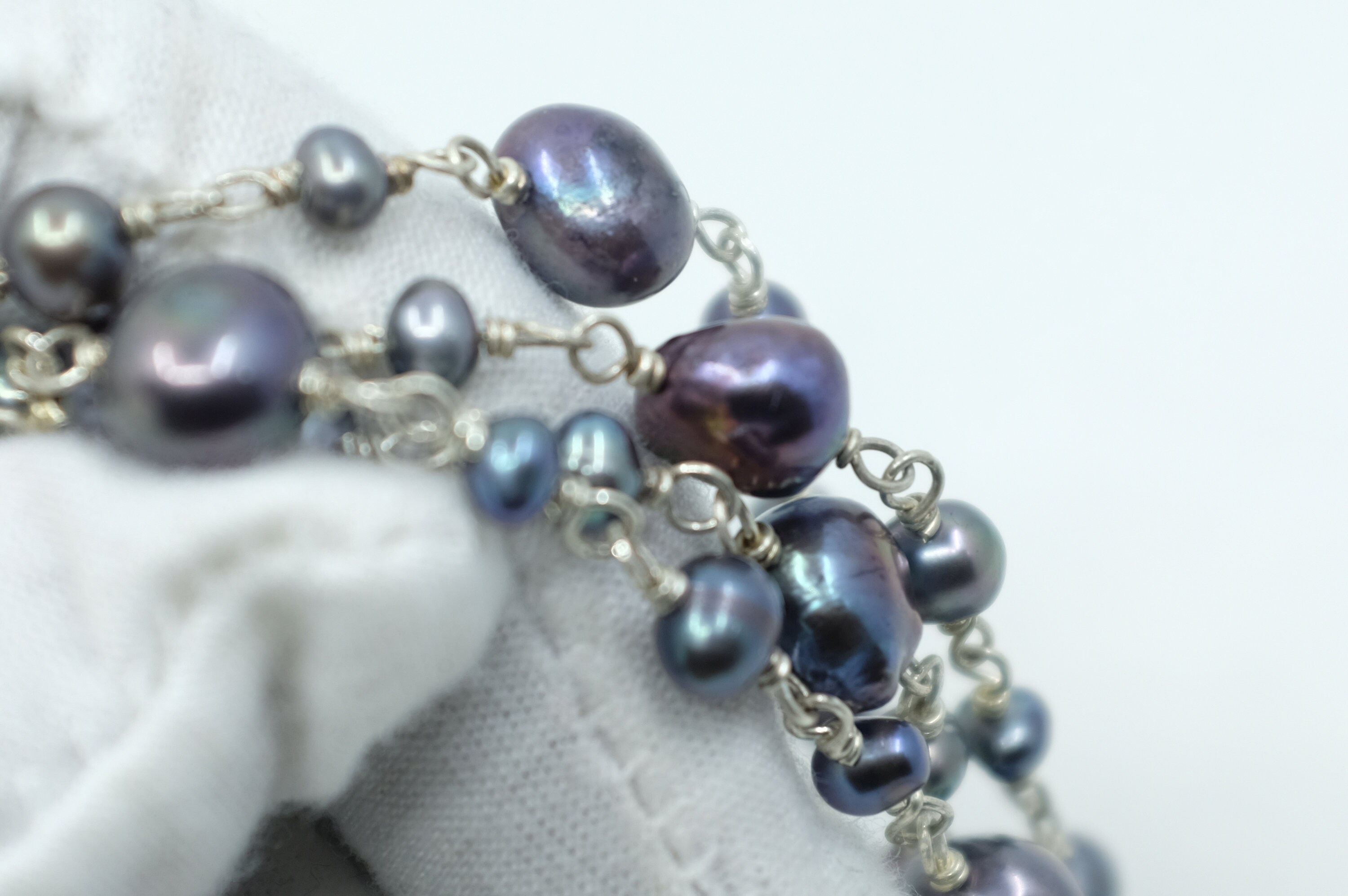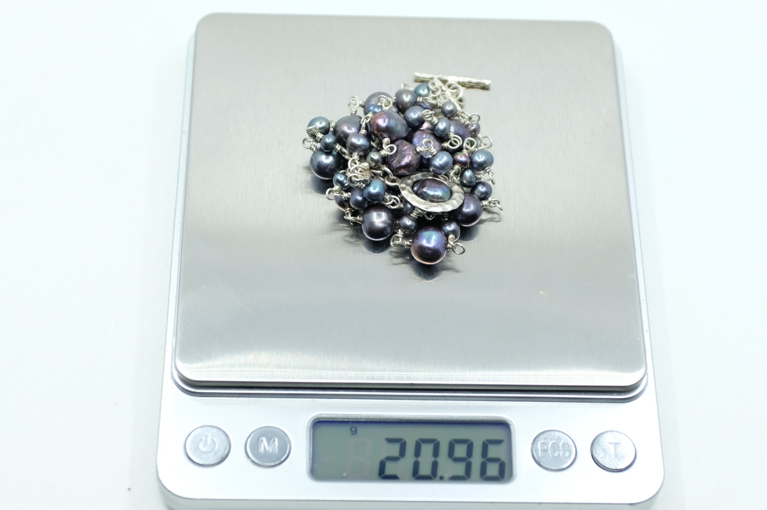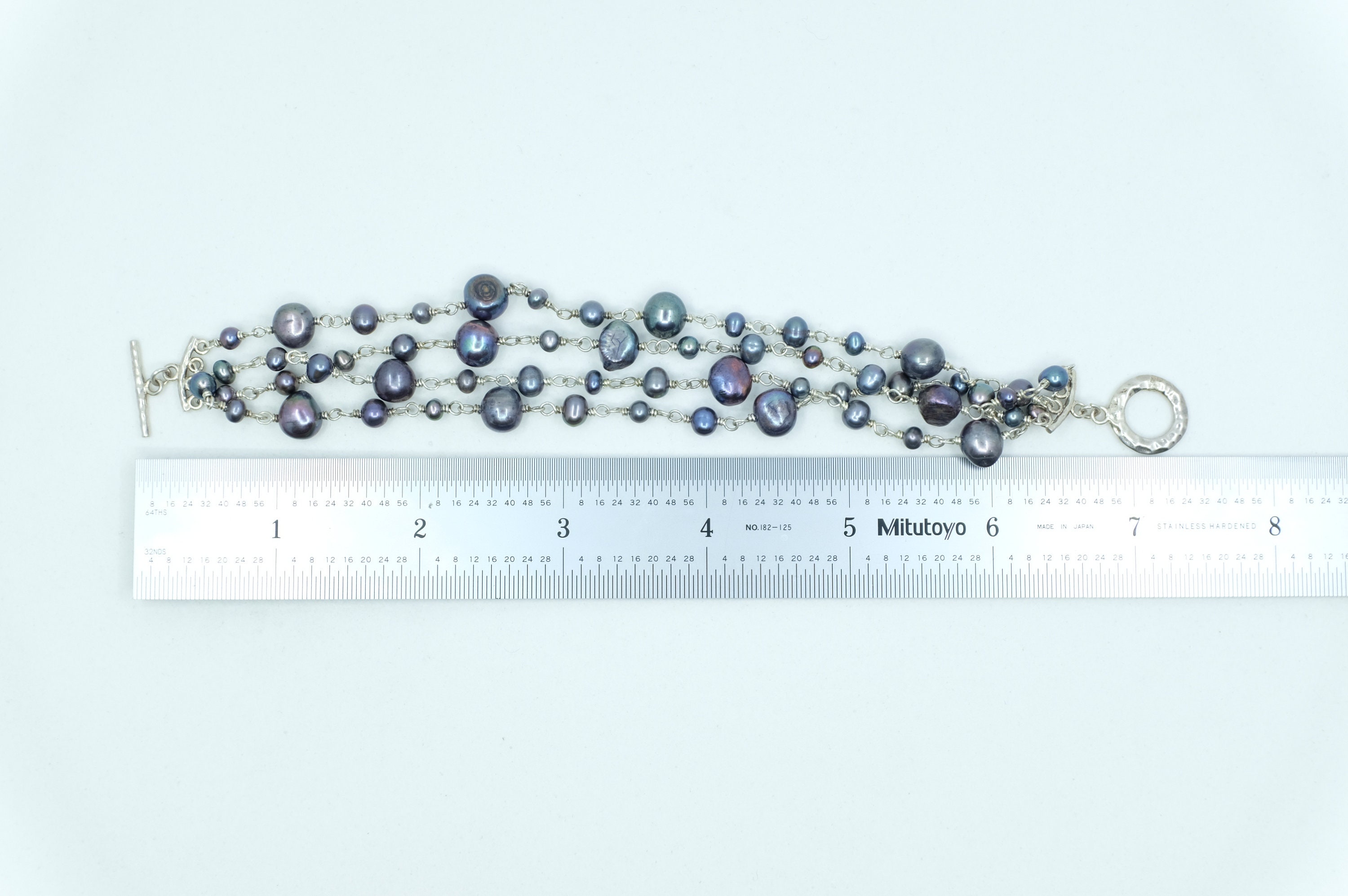 This bracelet features a contemporary design, where organic, baroque freshwater black pearls in mesmerizing peacock hues (shifting from deep indigo to emerald and charcoal) are lovingly hand-selected and spaced on a luxurious sterling silver chain with a toggle clasp. No two pearls are alike: their natural, one-of-a-kind baroque shapes and subtle size variations ensure your bracelet is utterly unique…just like you.